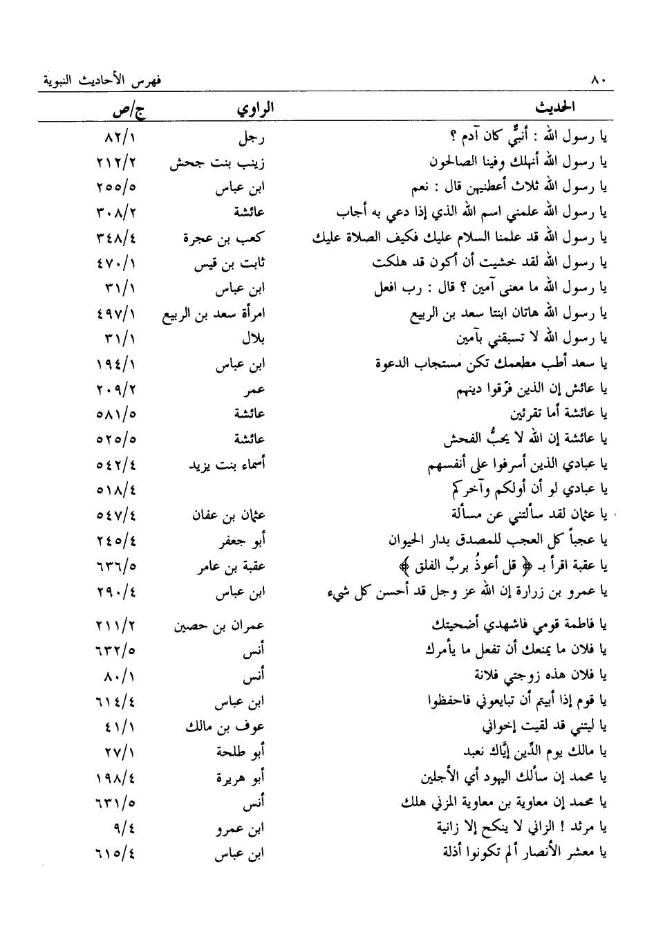 يا رسول الله: أنبيّ كان آدم؟: رجل: 1/ 82 يا رسول الله أنهلك وفينا الصالحون: زينب بنت جحش: 2/ 212 يَا رَسُولَ اللَّهِ ثَلَاثٌ أَعْطِنِيهِنَّ قَالَ: نَعَمْ: ابن عباس: 5/ 255 يَا رَسُولَ اللَّهِ عَلِّمْنِي اسْمَ اللَّهِ الَّذِي إِذَا دُعِيَ بِهِ أَجَابَ: عائشة: 2/ 308 يَا رَسُولَ اللَّهِ قَدْ عَلِمْنَا السَّلَامَ عَلَيْكَ فكيف الصلاة عليك: كعب بن عجرة: 4/ 348 يَا رَسُولَ اللَّهِ لَقَدْ خَشِيتُ أَنْ أَكُونَ قد هلكت: ثابت بن قيس: 1/ 470 يَا رَسُولَ اللَّهِ مَا مَعْنَى آمِينْ؟ قَالَ: رب افعل: ابن عباس: 1/ 31 يَا رَسُولَ اللَّهِ هَاتَانِ ابْنَتَا سَعْدِ بْنِ الربيع: امرأة سعد بن الربيع: 1/ 497 يا رسول الله لا تسبقني بآمين: بلال: 1/ 31 يَا سَعْدُ أَطِبْ مَطْعَمَكَ تَكُنْ مُسْتَجَابَ الدَّعْوَةِ: ابن عباس: 1/ 194 يا عائش إن الذين فرّقوا دينهم: عمر: 2/ 209 يا عائشة أما تقرئين: عائشة: 5/ 581 يَا عَائِشَةُ إِنَّ اللَّهَ لَا يُحِبُّ الْفُحْشَ: عائشة: 5/ 525 يا عبادي الذين أسرفوا على أنفسهم: أسماء بنت يزيد: 4/ 542 يا عبادي لو أن أولكم وآخركم:: 4/ 518 يا عثمان لقد سألتني عن مسألة: عثمان بن عفان: 4/ 547 يَا عَجَبًا كُلَّ الْعَجَبِ لِلْمُصَدِّقِ بِدَارِ الْحَيَوَانِ: أبو جعفر: 4/ 245 يا عقبة اقرأ ب قل أعوذ بربّ الفلق: عقبة بن عامر: 5/ 636 يَا عَمْرُو بْنَ زُرَارَةَ إِنَّ اللَّهَ عَزَّ وجل قد أحسن كل شيء: ابن عباس: 4/ 290 يا فاطمة قومي فاشهدي أضحيتك: عمران بن حصين: 2/ 211 يَا فُلَانُ مَا يَمْنَعُكَ أَنْ تَفْعَلَ مَا يأمرك: أنس: 5/ 632 يا فلان هذه زوجتي فلانة: أنس: 1/ 80 يَا قَوْمِ إِذَا أَبَيْتُمْ أَنْ تُبَايِعُونِي فَاحْفَظُوا: ابن عباس: 4/ 614 يا ليتني قد لقيت إخواني: عوف بن مالك: 1/ 41 يا مالك يوم الدّين إيّاك نعبد: أبو طلحة: 1/ 27 يَا مُحَمَّدُ إِنْ سَأَلَكَ الْيَهُودُ أَيَّ الْأَجَلَيْنِ: أبو هريرة: 4/ 198 يَا مُحَمَّدُ إِنَّ مُعَاوِيَةَ بْنَ مُعَاوِيَةَ الْمُزَنِيَّ هلك: أنس: 5/ 631 يَا مَرْثَدُ! الزَّانِي لَا يَنْكِحُ إلَّا زَانِيَةً: ابن عمرو: 4/ 9 يا معشر الأنصار ألم تكونوا أذلة: ابن عباس: 4/ 615