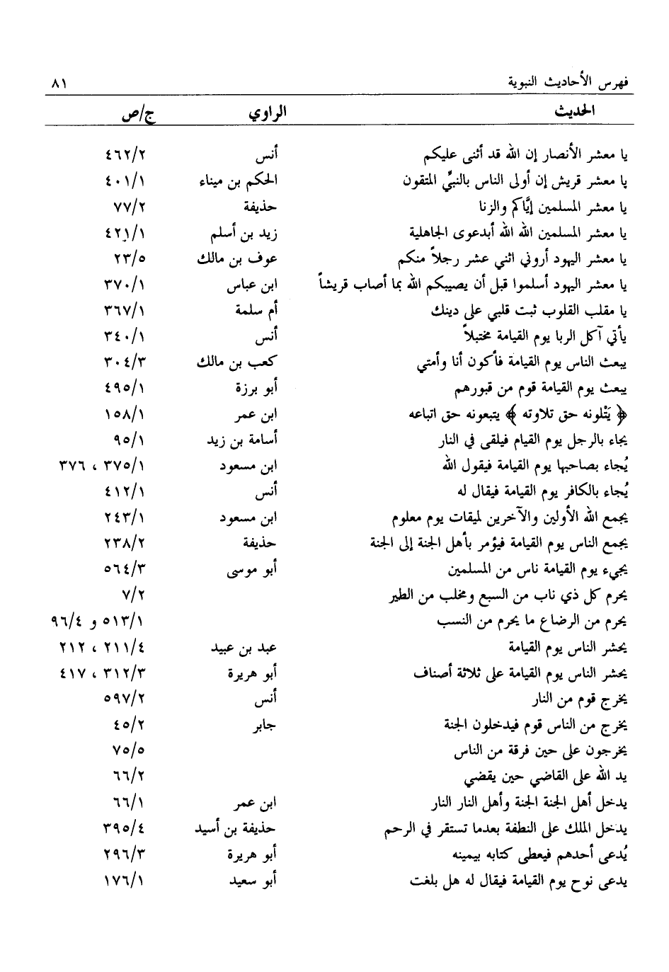 يَا مَعْشَرَ الْأَنْصَارِ إِنَّ اللَّهَ قَدْ أَثْنَى عليكم: أنس: 2/ 462 يَا مَعْشَرَ قُرَيْشٍ إِنَّ أَوْلَى النَّاسِ بِالنَّبِيِّ المتقون: الحكم بن ميناء: 1/ 401 يا معشر المسلمين إيّاكم والزنا: حذيفة: 2/ 77 يَا مَعْشَرَ الْمُسْلِمِينَ اللَّهَ اللَّهَ أَبِدَعْوَى الْجَاهِلِيَّةِ: زيد بن أسلم: 1/ 421 يَا مَعْشَرَ الْيَهُودِ أَرُونِي اثْنَيْ عَشَرَ رَجُلًا منكم: عوف بن مالك: 5/ 23 يا معشر اليهود أَسْلِمُوا قَبْلَ أَنْ يُصِيبَكُمُ اللَّهُ بِمَا أَصَابَ قريشا: ابن عباس: 1/ 370 يَا مُقَلِّبَ الْقُلُوبِ ثَبِّتْ قَلْبِي عَلَى دِينِكَ: أم سلمة: 1/ 367 يأتي آكل الربا يوم القيامة مختبلا: أنس: 1/ 340 يُبْعَثُ النَّاسُ يَوْمَ الْقِيَامَةِ فَأَكُونُ أَنَا وَأُمَّتِي: كعب بن مالك: 3/ 304 يبعث يوم القيامة قوم من قبورهم: أبو برزة: 1/ 495 يتلونه حق تلاوته يتبعونه حق اتباعه: ابن عمر: 1/ 158 يجاء بالرجل يوم القيام فيلقى في النار: أسامة بن زيد: 1/ 95 يجاء بصاحبها يوم القيامة فيقول الله: ابن مسعود: 1/ 375، 376 يجاء بالكافر يوم القيامة فيقال له: أنس: 1/ 412 يَجْمَعُ اللَّهُ الْأَوَّلِينَ وَالْآخِرِينَ لِمِيقَاتِ يَوْمٍ مَعْلُومٍ: ابن مسعود: 1/ 243 يُجْمَعُ النَّاسُ يَوْمَ الْقِيَامَةِ فَيُؤْمَرُ بِأَهْلِ الْجَنَّةِ إلى الجنة: حذيفة: 2/ 238 يجيء يوم القيامة ناس من المسلمين: أبو موسى: 3/ 564 يَحْرُمُ كُلُّ ذِي نَابٍ مِنَ السَّبُعِ وَمِخْلَبٍ من الطير:: 2/ 7 يَحْرُمُ مِنَ الرَّضَاعِ مَا يَحْرُمُ مِنَ النَّسَبِ:: 1/ 513 و 4/ 96 يحشر الناس يوم القيامة: عبد بن عبيد: 4/ 211، 212 يُحْشَرُ النَّاسُ يَوْمَ الْقِيَامَةِ عَلَى ثَلَاثَةِ أَصْنَافٍ: أبو هريرة: 3/ 312، 417 يخرج قوم من النار: أنس: 2/ 597 يخرج