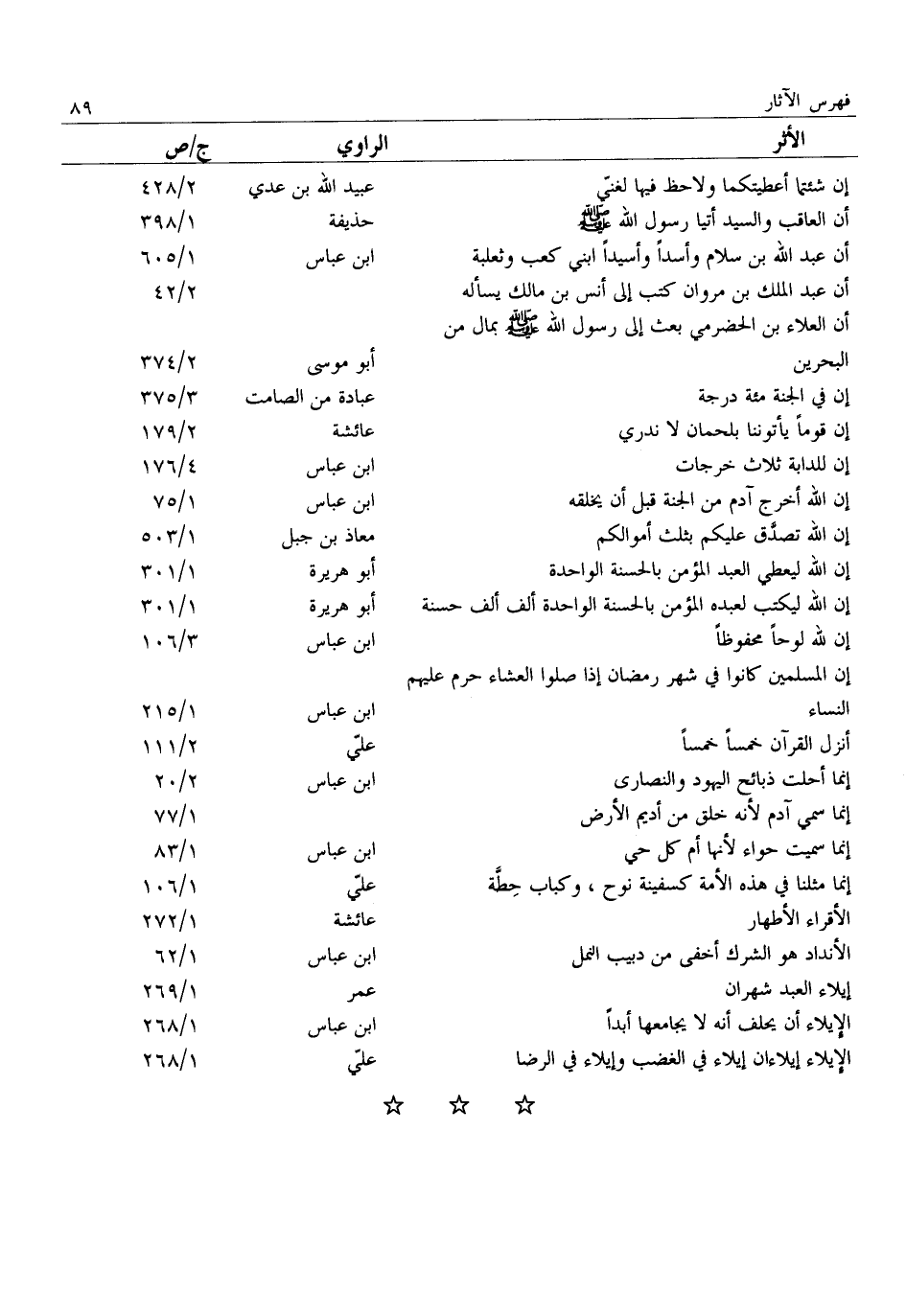 إن شئتما أعطيتكما ولاحظ فيها لغنيّ: عبيد الله بن عدي: 2/ 428 أَنَّ الْعَاقِبَ وَالسَّيِّدَ أَتَيَا رَسُولَ اللَّهِ صَلَّى الله عليه وسلم: حذيفة: 1/ 398 أَنَّ عَبْدَ اللَّهِ بْنَ سَلَامٍ وَأَسَدًا وَأُسَيْدًا ابني كعب وثعلبة: ابن عباس: 1/ 605 أَنَّ عَبْدَ الْمَلِكِ بْنَ مَرْوَانَ كَتَبَ إِلَى أنس بن مالك يسأله:: 2/ 42 أَنَّ الْعَلَاءَ بْنَ الْحَضْرَمِيِّ بَعَثَ إِلَى رَسُولِ اللَّهِ صَلَّى اللَّهُ عَلَيْهِ وَسَلَّمَ بِمَالٍ مِنَ البحرين: أبو موسى: 2/ 374 إن في الجنة مائة درجة: عبادة من الصامت: 3/ 375 إن قوما يأتوننا بلحمان لا ندري: عائشة: 2/ 179 إن للدابة ثلاث خرجات: ابن عباس: 4/ 176 إِنَّ اللَّهَ أَخْرَجَ آدَمَ مِنَ الْجَنَّةِ قَبْلَ أن يخلقه: ابن عباس: 1/ 75 إن الله تصدّق عليكم بثلث أموالكم: معاذ بن جبل: 1/ 503 إِنَّ اللَّهَ لِيُعْطِيَ الْعَبْدَ الْمُؤْمِنَ بِالْحَسَنَةِ الْوَاحِدَةِ: أبو هريرة: 1/ 301 إِنَّ اللَّهَ لَيَكْتُبُ لِعَبْدِهِ الْمُؤْمِنِ بِالْحَسَنَةِ الْوَاحِدَةِ ألف ألف حسنة: أبو هريرة: 1/ 301 إن لله لوحا محفوظا: ابن عباس: 3/ 106 إِنَّ الْمُسْلِمِينَ كَانُوا فِي شَهْرِ رَمَضَانَ إِذَا صلوا العشاء حرم عليهم النساء: ابن عباس: 1/ 215 أنزل القرآن خمسا خمسا: عليّ: 2/ 111 إنما أحلت ذبائح اليهود والنصارى: ابن عباس: 2/ 20 إِنَّمَا سُمِّيَ آدَمَ لِأَنَّهُ خُلِقَ مِنْ أَدِيمِ الأرض:: 1/ 77 إِنَّمَا سُمِّيَتْ حَوَّاءَ لِأَنَّهَا أُمُّ كُلِّ حَيٍّ: ابن عباس: 1/ 83 إِنَّمَا مَثَلُنَا فِي هَذِهِ الْأُمَّةِ كَسَفِينَةِ نُوحٍ، وكباب حطّة: عليّ: 1/ 106 الأقراء الأطهار: عائشة: 1/ 272 الْأَنْدَادُ