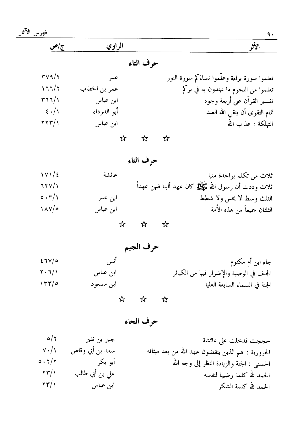ثلاث من تكلم بواحدة منها: عائشة: 4/ 171 ثَلَاثٌ وَدِدْتُ أَنَّ رَسُولَ اللَّهِ صَلَّى اللَّهُ عَلَيْهِ وَسَلَّمَ كان عهد إلينا فيهن عهدا:: 1/ 627 الثلث وسط لا بخس ولا شطط: ابن عمر: 1/ 503 الثلثان جميعا من هذه الأمة: ابن عباس: 5/ 187
