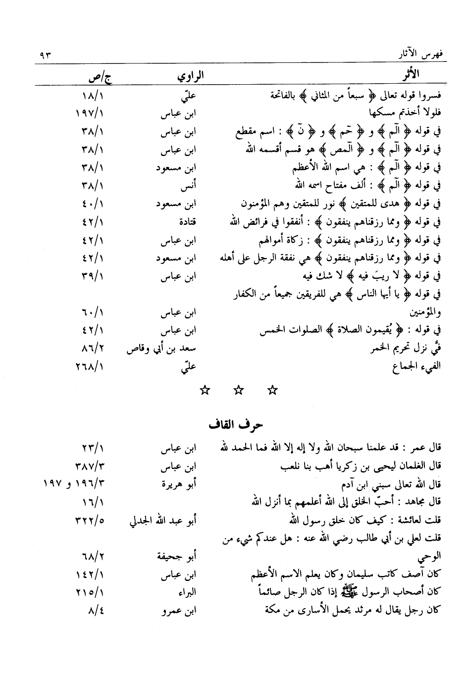 فسروا قوله تعالى سبعا من المثاني بالفاتحة: عليّ: 1/ 18 فلولا أخذتم مسكها: ابن عباس: 1/ 197 في قوله الم وحم ون: اسم مقطع: ابن عباس: 1/ 38 في قوله الم والمص هو قسم أقسمه الله: ابن عباس: 1/ 38 في قوله الم: هي اسم الله الأعظم: ابن مسعود: 1/ 38 في قوله الم: ألف مفتاح اسمه الله: أنس: 1/ 38 في قوله هدى للمتقين نور للمتقين وهم المؤمنون: ابْنِ مَسْعُودٍ: 1/ 40 فِي قَوْلِهِ وَمِمَّا رَزَقْنَاهُمْ يُنْفِقُونَ: أنفقوا في فرائض الله: قتادة: 1/ 42 في قوله ومما رزقناهم ينفقون: زكاة أموالهم: ابن عباس: 1/ 42 في قوله ومما رزقناهم ينفقون هي نفقة الرجل على أهله: ابن مسعود: 1/ 42 في قوله لا ريب فيه لا شك فيه: ابْنِ عَبَّاسٍ: 1/ 39 فِي قَوْلِهِ يَا أَيُّهَا النَّاسُ هي للفريقين جميعا من الكفار والمؤمنين: ابن عباس: 1/ 60 في قوله: يقيمون الصلاة الصلوات الخمس: ابن عباس: 1/ 42 فيّ نزل تحريم الخمر: سعد بن أبي وقاص: 2/ 86 الفيء الجماع: عليّ: 1/ 268