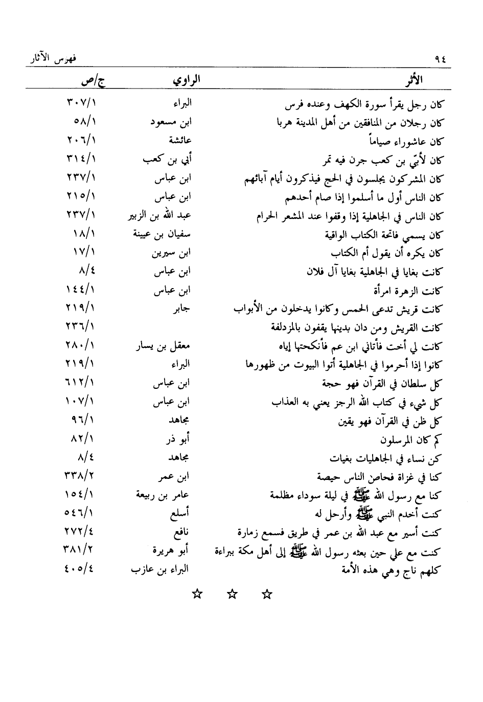 كَانَ رَجُلٌ يَقْرَأُ سُورَةَ الْكَهْفِ وَعِنْدَهُ فَرَسٌ: البراء: 1/ 307 كَانَ رَجُلَانِ مِنَ الْمُنَافِقِينَ مِنْ أَهْلِ الْمَدِينَةِ هربا: ابن مسعود: 1/ 58 كان عاشوراء صياما: عائشة: 1/ 206 كان لأبيّ بن كعب جرن فيه تمر: أبي بن كعب: 1/ 314 كَانَ الْمُشْرِكُونَ يَجْلِسُونَ فِي الْحَجِّ فَيَذْكُرُونَ أَيَّامَ آبائهم: ابن عباس: 1/ 237 كَانَ النَّاسُ أَوَّلَ مَا أَسْلَمُوا إِذَا صَامَ أحدهم: ابن عباس: 1/ 215 كَانَ النَّاسُ فِي الْجَاهِلِيَّةِ إِذَا وَقَفُوا عِنْدَ المشعر الحرام: عبد الله بن الزبير: 1/ 237 كان يسمي فاتحة الكتاب الواقية: سفيان بن عيينة: 1/ 18 كان يكره أن يقول أم الكتاب: ابن سيرين: 1/ 17 كَانَتْ بَغَايَا فِي الْجَاهِلِيَّةِ بَغَايَا آلِ فُلَانٍ: ابن عباس: 4/ 8 كانت الزهرة امرأة: ابن عباس: 1/ 144 كَانَتْ قُرَيْشٌ تُدْعَى الْحُمْسَ وَكَانُوا يَدْخُلُونَ مِنَ الأبواب: جابر: 1/ 219 كانت القريش ومن دان بدينها يقفون بالمزدلفة:: 1/ 236 كَانَتْ لِي أُخْتٌ فَأَتَانِي ابْنُ عَمٍّ فَأَنْكَحْتُهَا إياه: معقل بن يسار: 1/ 280 كَانُوا إِذَا أَحْرَمُوا فِي الْجَاهِلِيَّةِ أَتَوُا الْبُيُوتَ من ظهورها: البراء: 1/ 219 كل سلطان في القرآن فهو حجة: ابن عباس: 1/ 612 كل شيء في كتاب الله الرجز يعني به العذاب: ابن عباس: 1/ 107 كل ظن في القرآن فهو يقين: مجاهد: 1/ 96 كم كان المرسلون: أبو ذر: 1/ 82 كن نساء في الجاهليات بغيات: مجاهد: 4/ 8 كنا في غزاة فحاص الناس حيصة: ابن عمر: 2/ 338 كُنَّا مَعَ رَسُولِ اللَّهِ صَلَّى اللَّهُ عَلَيْهِ وَسَلَّمَ في ليلة سوداء مظلمة: عامر بن ربيعة: 1/ 154 كنت أخدم النبي صلّى الله عليه وسلم وأرحل له: أسلع: 1/ 546 كُنْتُ أَسِيرُ مَعَ عَبْدِ اللَّهِ بْنِ عُمَرَ في طريق فسمع زمارة: نافع: 4/ 272 كُنْتُ مَعَ عَلِيٍّ حِينَ بَعَثَهُ رَسُولُ اللَّهِ صَلَّى اللَّهُ عَلَيْهِ وَسَلَّمَ إِلَى أَهْلِ مَكَّةَ ببراءة: أبو هريرة: 2/ 381 كلهم ناج وهي هذه الأمة: البراء بن عازب: 4/ 405