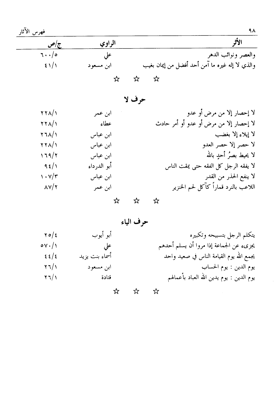 لَا إِحْصَارَ إِلَّا مِنْ مَرَضٍ أَوْ عَدُوٍّ: ابن عمر: 1/ 228 لَا إِحْصَارَ إِلَّا مِنْ مَرَضٍ أَوْ عَدُوٍّ أو أمر حادث: عطاء: 1/ 228 لا إيلاء إلا بغضب: ابن عباس: 1/ 268 لا حصر إلا حصر العدو: ابن عباس: 1/ 228 لا يحيط بصر أحد بالله: ابن عباس: 2/ 169 لَا يَفْقَهُ الرَّجُلُ كُلَّ الْفِقْهِ حَتَّى يَمْقُتَ الناس: أبو الدرداء: 1/ 94 لا ينفع الحذر من القدر: ابن عباس: 3/ 107 اللاعب بالنرد قمارا كآكل لحم الخنزير: ابن عمر: 2/ 87