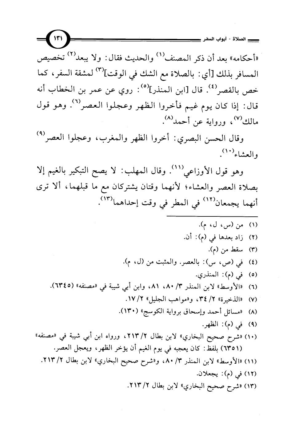 "أحكامه" بعد أن ذكر المصنف (¬1) والحديث فقال: ولا يبعد (¬2) تخصيص المسافر بذلك [أي: بالصلاة مع الشك في الوقت] (¬3) لمشقة السفر، كما خص بالقصر (¬4). قال [ابن المنذر] (¬5): روي عن عمر بن الخطاب أنه قال: إذا كان يوم غيم فأخروا الظهر وعجلوا العصر (¬6). وهو قول مالك (¬7)، ورواية عن أحمد (¬8).