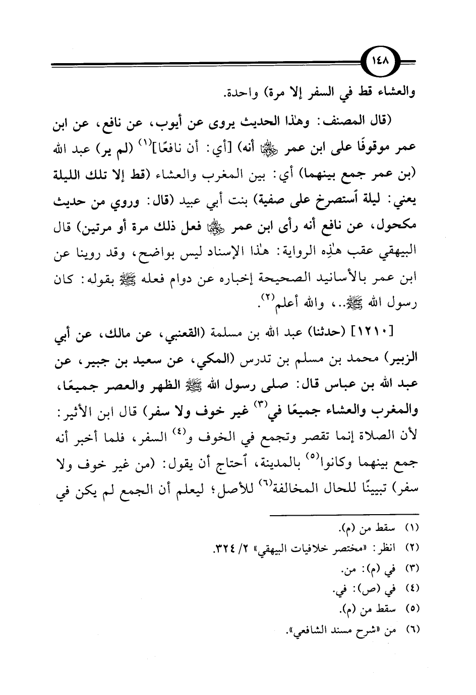 (قال المصنف: وهذا الحديث يروى عن أيوب، عن نافع، عن ابن عمر موقوفًا على ابن عمر - رضي الله عنهما - أنه) [أي: أن نافعًا] (¬1) (لم ير) عبد الله (بن عمر جمع بينهما) أي: بين المغرب والعشاء (قط إلا تلك الليلة يعني: ليلة استصرخ على صفية) بنت أبي عبيد (قال: وروي من حديث مكحول، عن نافع أنه رأى ابن عمر - رضي الله عنهما - فعل ذلك مرة أو مرتين) قال البيهقي عقب هذِه الرواية: هذا الإسناد ليس بواضح، وقد روينا عن ابن عمر بالأسانيد الصحيحة إخباره عن دوام فعله - صلى الله عليه وسلم - بقوله: كان رسول الله - صلى الله عليه وسلم -. .، والله أعلم (¬2).