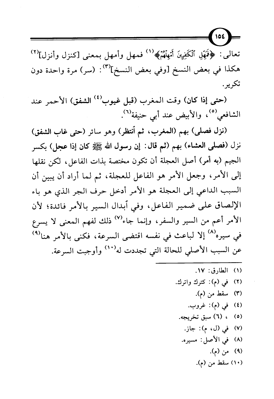 تعالى: {فَمَهِّلِ الْكَافِرِينَ أَمْهِلْهُمْ} (¬1) فمهل وأمهل بمعنى [كنزل وأنزل] (¬2) هكذا في بعض النسخ [وفي بعض النسخ] (¬3): (سر) مرة واحدة دون تكرير.