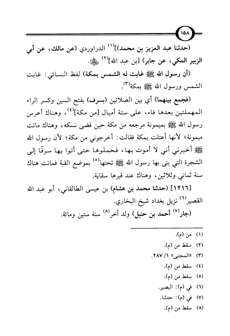 (فجمع بينهما) أي بين الصلاتين (بسرف) بفتح السين وكسر الراء المهملتين بعدها فاء، على ستة أميال [من مكة] (¬4)، وهناك أعرس رسول الله - صلى الله عليه وسلم - بميمونة مرجعه من مكة حين قضى نسكه، وهناك ماتت ميمونة؛ لأنها اعتلت بمكة فقالت: أخرجوني من مكة؛ لأن رسول الله - صلى الله عليه وسلم - أخبرني أني لا أموت بها، فحملوها حتى أتوا بها سرفًا إلى الشجرة التي بنى بها رسول الله - صلى الله عليه وسلم - تحتها (¬5) بموضع القبة فماتت هناك سنة ثماني وثلاثين، وهناك عند قبرها سقاية.