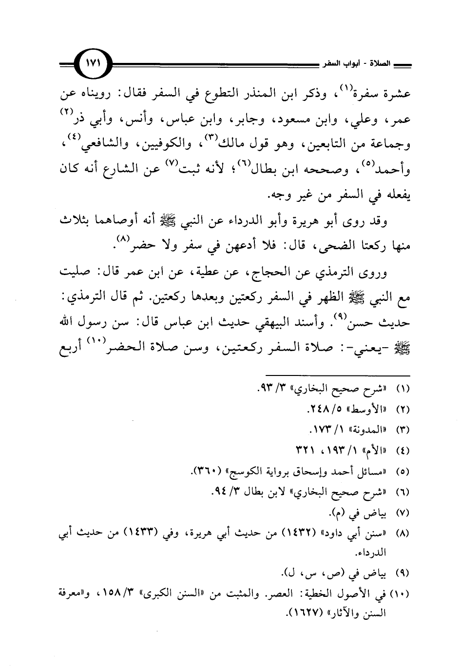 عشرة سفرة (¬1)، وذكر ابن المنذر التطوع في السفر فقال: رويناه عن عمر، وعلي، وابن مسعود، وجابر، وابن عباس، وأنس، وأبي ذر (¬2) وجماعة من التابعين، وهو قول مالك (¬3)، والكوفيين، والشافعي (¬4)، وأحمد (¬5)، وصححه ابن بطال (¬6)؛ لأنه ثبت (¬7) عن الشارع أنه كان يفعله في السفر من غير وجه.
