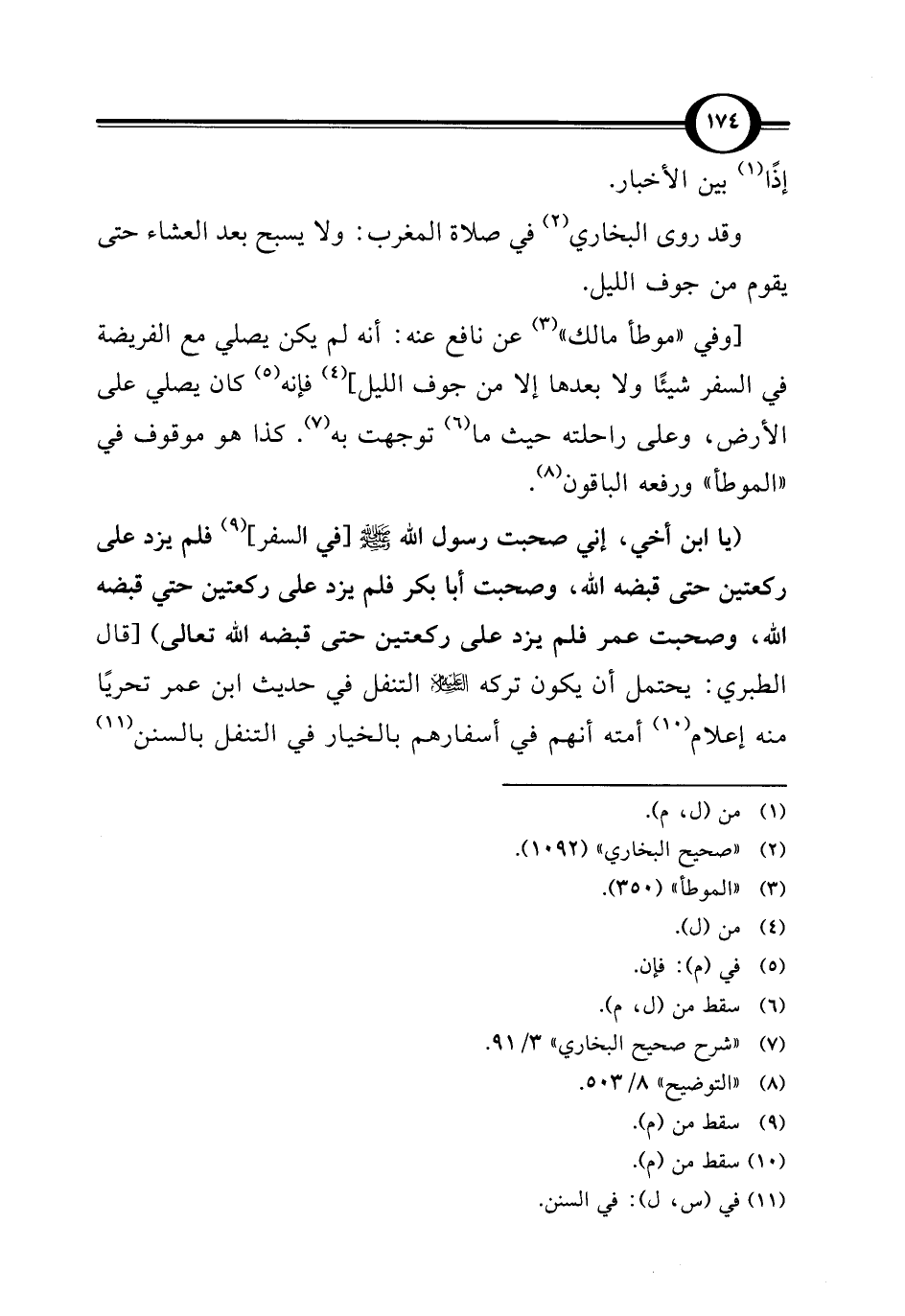 وقد روى البخاري (¬2) في صلاة المغرب: ولا يسبح بعد العشاء حتى يقوم من جوف الليل.