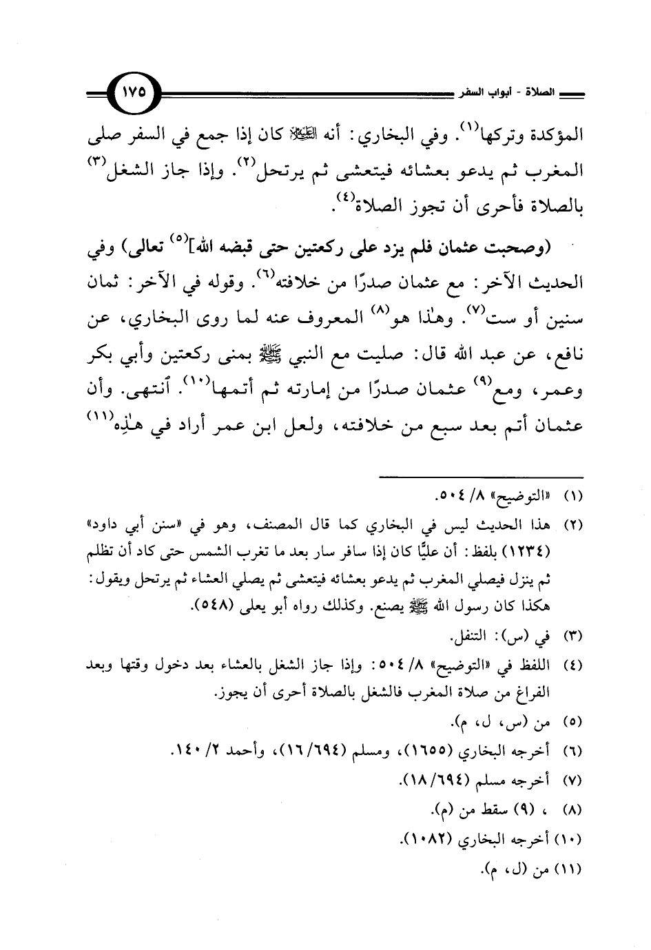 المؤكدة وتركها (¬1). وفي البخاري: أنه - عليه السلام - كان إذا جمع في السفر صلى المغرب ثم يدعو بعشائه فيتعشى ثم يرتحل (¬2). وإذا جاز الشغل (¬3) بالصلاة فأحرى أن تجوز الصلاة (¬4).