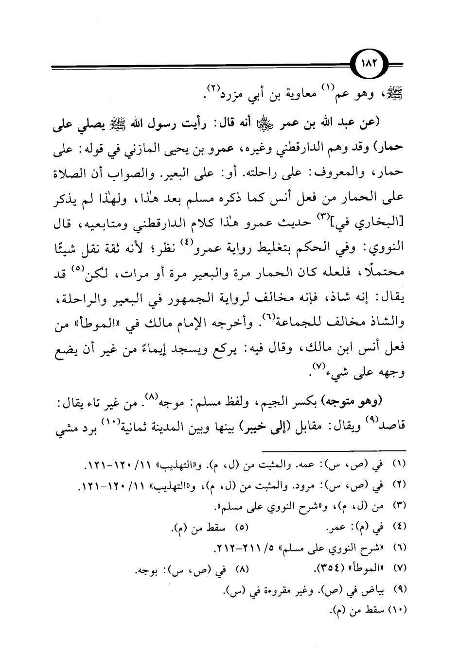 (عن عبد الله بن عمر - رضي الله عنهما - أنه قال: رأيت رسول الله - صلى الله عليه وسلم - يصلي على حمار) وقد وهم الدارقطني وغيره، عمرو بن يحيى المازني في قوله: على حمار، والمعروف: على راحلته. أو: على البعير. والصواب أن الصلاة على الحمار من فعل أنس كما ذكره مسلم بعد هذا، ولهذا لم يذكر [البخاري في] (¬3) حديث عمرو هذا كلام الدارقطني ومتابعيه، قال النووي: وفي الحكم بتغليط رواية عمرو (¬4) نظر؛ لأنه ثقة نقل شيئًا محتملًا، فلعله كان الحمار مرة والبعير مرة أو مرات، لكن (¬5) قد يقال: إنه شاذ، فإنه مخالف لرواية الجمهور في البعير والراحلة، والشاذ مخالف للجماعة (¬6). وأخرجه الإمام مالك في "الموطأ" من فعل أنس بن مالك، وقال فيه: يركع ويسجد إيماءً من غير أن يضع وجهه على شيء (¬7).