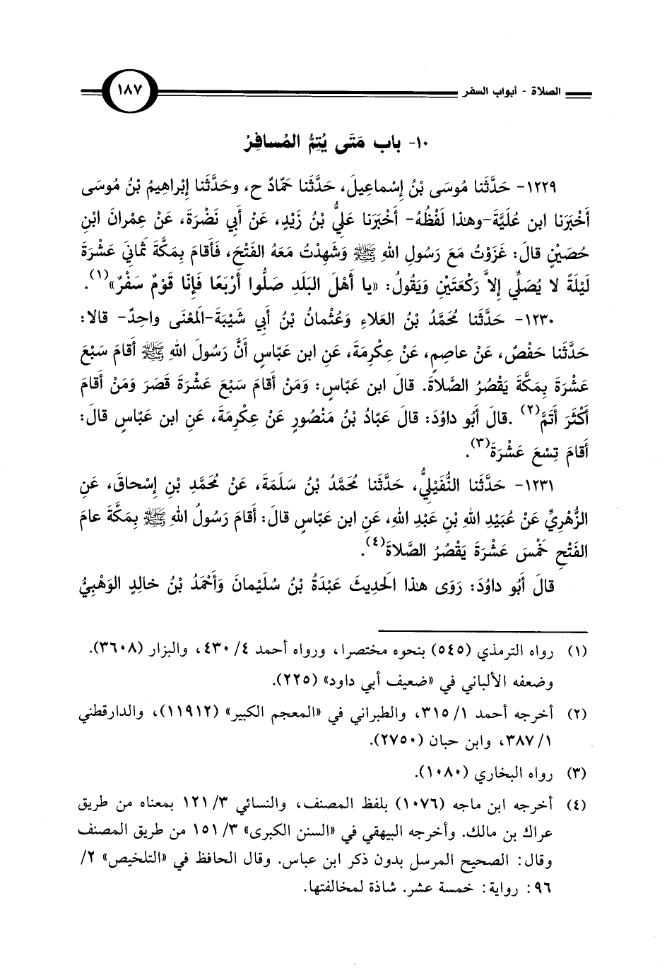 1229 - حَدَّثَنا مُوسَى بْنُ إِسْماعِيلَ، حَدَّثَنا حَمَّادٌ ح، وحَدَّثَنا إِبْراهِيمُ بْنُ مُوسَى أَخْبَرَنا ابن علَيَّةَ - وهذا لَفْظُهُ - أَخْبَرَنا عَلِيُّ بْنُ زَيْدٍ، عَنْ أَبِي نَضْرَةَ، عَنْ عِمْرانَ بْنِ حُصَيْنٍ قَالَ: غَزَوْتُ مَعَ رَسُولِ اللهِ - صلى الله عليه وسلم - وشَهِدْتُ مَعَهُ الفَتْحَ، فَأَقَامَ بِمَكَّةَ ثَمانِيَ عَشْرَةَ لَيْلَةً لا يُصَلِّي إِلَّا رَكْعَتَيْنِ وَيَقُولُ: "يا أَهْلَ البَلَدِ صَلُّوا أَرْبَعًا فَإِنّا قَوْمٌ سَفْرٌ" (¬1).