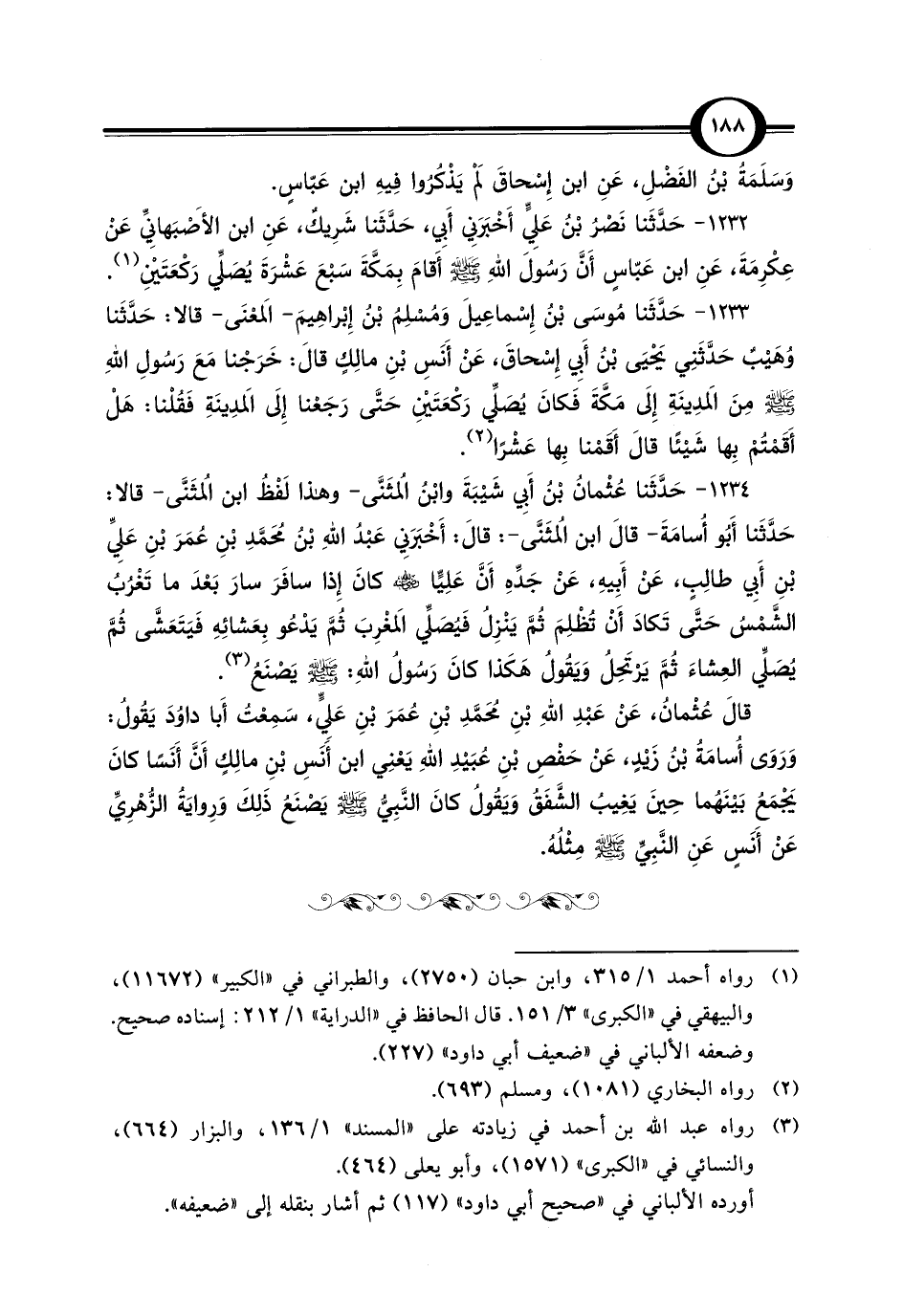 1234 - حَدَّثَنا عُثْمَانُ بْنُ أَبِي شَيْبَةَ وابْنُ المُثَنَّى - وهذا لَفْظُ ابن المُثَنَّى - قالا: حَدَّثَنا أَبُو أُسامَةَ - قَالَ ابن المُثَنَّى -: قَالَ: أَخْبَرَنِي عَبْدُ اللهِ بْنُ مُحَمَّدِ بْنِ عُمَرَ بْنِ عَلِيِّ بْنِ أَبِي طالِبٍ، عَنْ أَبِيهِ، عَنْ جَدِّهِ أَنَّ عَلِيًّا - رضي الله عنه - كَانَ إِذَا سَافَرَ سارَ بَعْدَ ما تَغْرُبُ الشَّمْسُ حَتَّى تَكادَ أَنْ تُظْلِمَ ثُمَّ يَنْزِلُ فَيُصَلِّي المَغْرِبَ ثُمَّ يَدْعُو بِعَشائِهِ فَيَتَعَشَّى ثُمَّ يُصَلِّي العِشاءَ ثُمَّ يَرْتَحِلُ وَيَقولُ هَكَذا كَانَ رَسُولُ اللهِ: - صلى الله عليه وسلم - يَصْنَعُ (¬3).