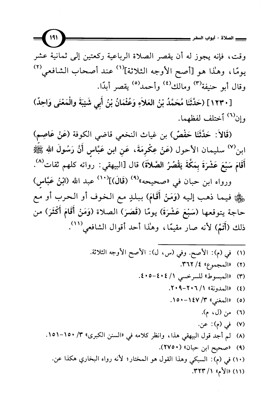وقت، فإنه يجوز له أن يقصر الصلاة الرباعية ركعتين إلى ثمانية عشر يومًا، وهذا هو [أصح الأوجه الثلاثة] (¬1) عند أصحاب الشافعي (¬2) وقال أبو حنيفة (¬3) ومالك (¬4) وأحمد (¬5) يقصر أبدًا.