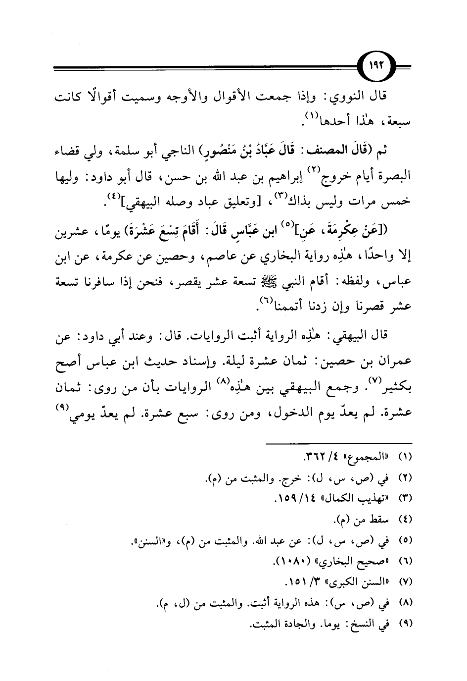 قال البيهقي: هذِه الرواية أثبت الروايات. قال: وعند أبي داود: عن عمران بن حصين: ثمان عشرة ليلة. وإسناد حديث ابن عباس أصح بكثير (¬7). وجمع البيهقي بين هذِه (¬8) الروايات بأن من روى: ثمان عشرة. لم يعدّ يوم الدخول، ومن روى: سبع عشرة. لم يعدّ يومي (¬9)