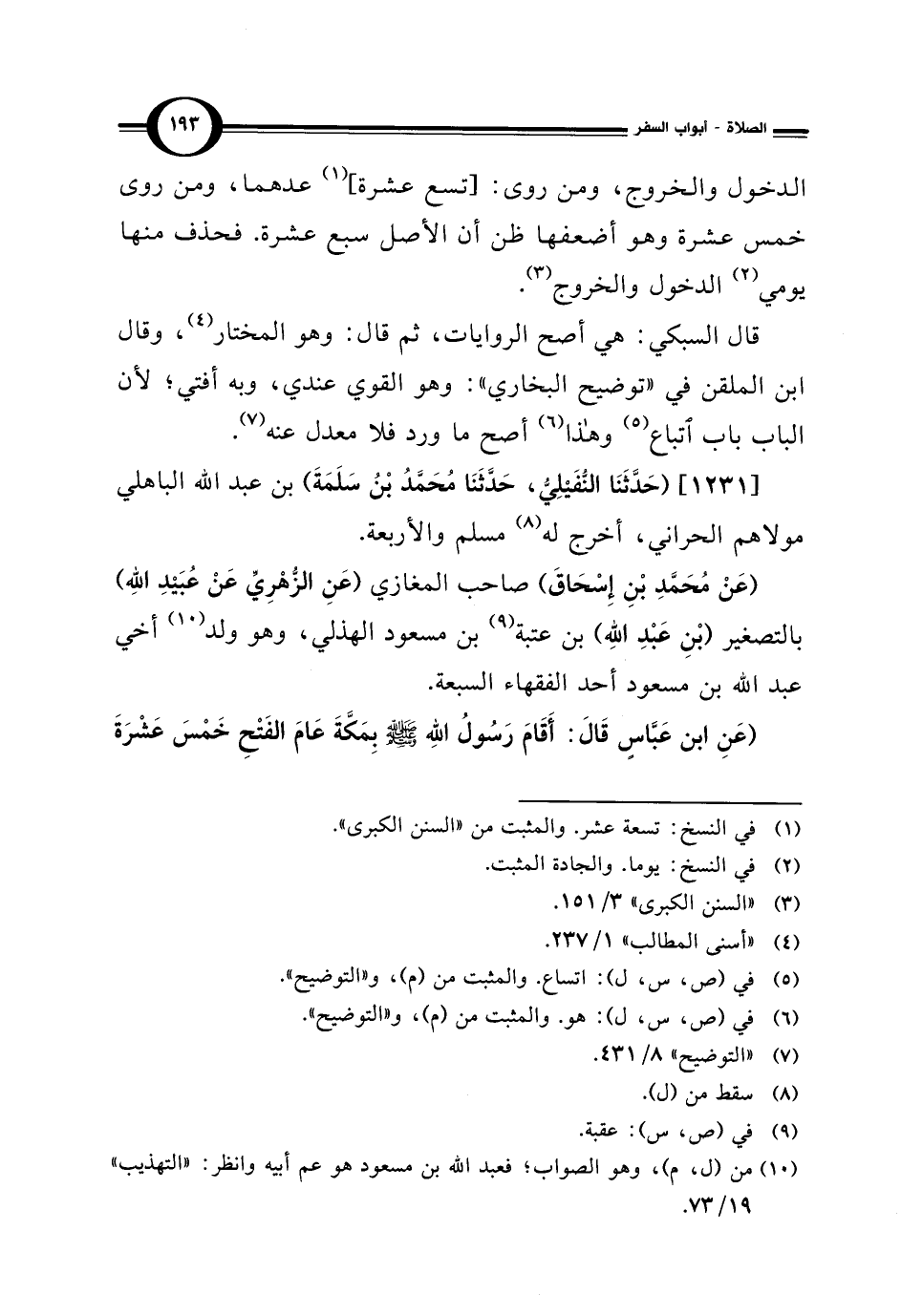 الدخول والخروج، ومن روى: [تسع عشرة] (¬1) عدهما، ومن روى خمس عشرة وهو أضعفها ظن أن الأصل سبع عشرة. فحذف منها يومي (¬2) الدخول والخروج (¬3).