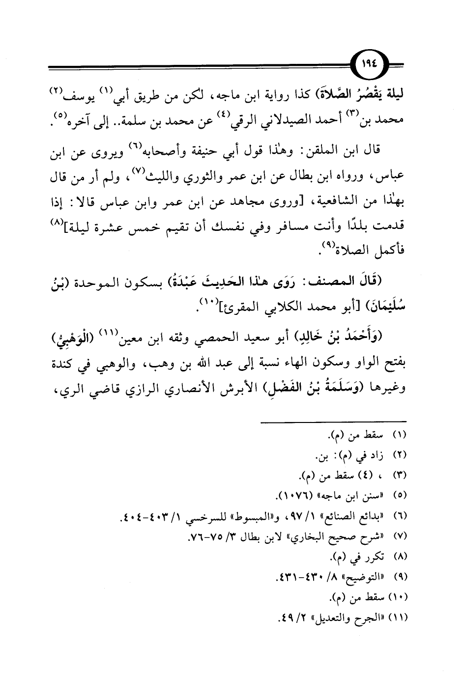 ليلة يَقْصُرُ الصَّلَاةَ) كذا رواية ابن ماجه، لكن من طريق أبي (¬1) يوسف (¬2) محمد بن (¬3) أحمد الصيدلاني الرقي (¬4) عن محمد بن سلمة. . إلى آخره (¬5).