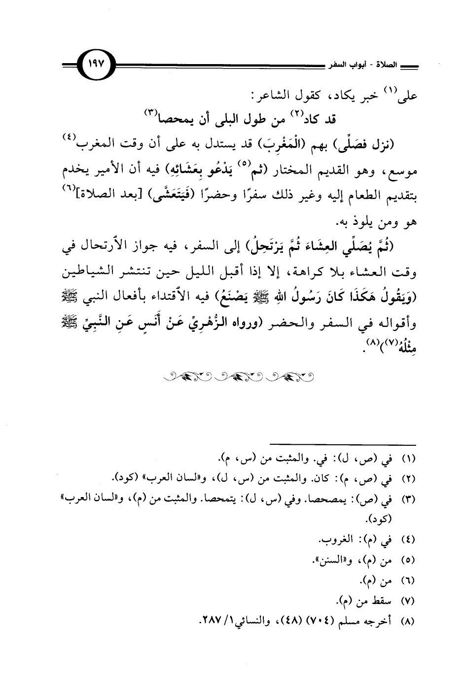 (نزل فصَلَّى) بهم (الْمَغْرِبَ) قد يستدل به على أن وقت المغرب (¬4) موسع، وهو القديم المختار (ثم (¬5) يَدْعُو بِعَشَائِهِ) فيه أن الأمير يخدم بتقديم الطعام إليه وغير ذلك سفرًا وحضرًا (فَيَتَعَشَّى) [بعد الصلاة] (¬6) هو ومن يلوذ به.