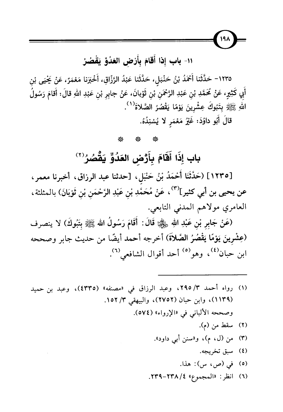 (عَنْ جَابِرِ بْنِ عَبْدِ اللهِ - رضي الله عنهما - قَالَ: أَقَامَ رَسُولُ الله - صلى الله عليه وسلم - بِتَبُوكَ) لا ينصرف (عِشْرِينَ يَوْمًا يَقْصُرُ الصَّلَاةَ) أخرجه أحمد أيضًا من حديث جابر وصححه ابن حبان (¬4)، وهو (¬5) أحد أقوال الشافعي (¬6).