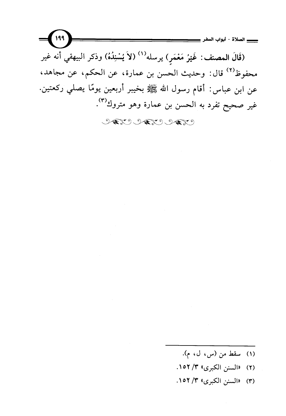 (قَالَ المصنف: غَيْرُ مَعْمَرٍ) يرسله (¬1) (لَا يُسْنِدُهُ) وذكر البيهقي أنه غير محفوظ (¬2) قال: وحديث الحسن بن عمارة، عن الحكم، عن مجاهد، عن ابن عباس: أقام رسول الله - صلى الله عليه وسلم - بخيبر أربعين يومًا يصلي ركعتين. غير صحيح تفرد به الحسن بن عمارة وهو متروك (¬3).