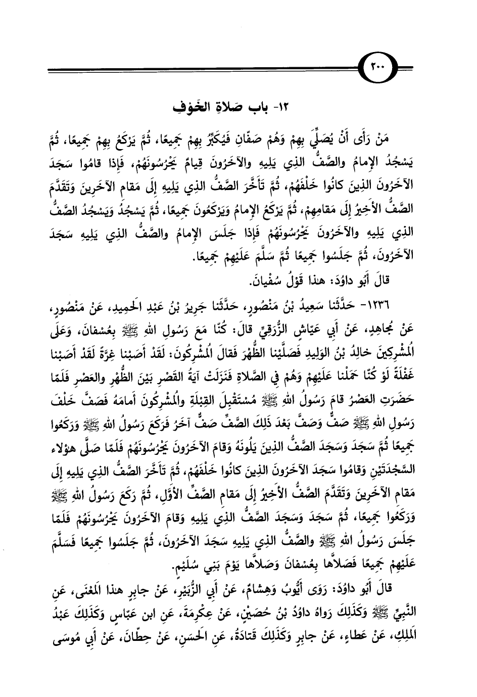 1236 - حَدَّثَنا سَعِيدُ بْنُ مَنْصُورٍ، حَدَّثَنا جَرِيرُ بْنُ عَبْدِ الحَمِيدِ، عَنْ مَنْصُورٍ، عَنْ مُجاهِدٍ، عَنْ أَبِي عَيَّاشٍ الزُّرَقِيِّ قَالَ: كُنَّا مَعَ رَسُولِ اللهِ - صلى الله عليه وسلم - بِعُسْفانَ، وَعَلَى المُشْرِكِينَ خالِدُ بْنُ الوَلِيدِ فَصَلَّيْنا الظُّهْرَ فَقَالَ المُشْرِكُونَ: لَقَدْ أَصَبْنا غِرَّةً لَقَدْ أَصَبْنا غَفْلَةً لَوْ كُنّا حَمَلْنا عَلَيْهِمْ وَهُمْ فِي الصَّلاةِ فَنَزَلَتْ آيَةُ القَصْرِ بَيْنَ الظُّهْرِ والعَصْرِ فَلَمّا حَضَرَتِ العَصْرُ قَامَ رَسُولُ اللهِ - صلى الله عليه وسلم - مُسْتَقْبِلَ القِبْلَةِ والمُشْرِكُونَ أَمَامَهُ فَصَفَّ خَلْفَ رَسُولِ اللهِ - صلى الله عليه وسلم - صَفٌّ وَصَفَّ بَعْدَ ذَلِكَ الصَّفِّ صَفٌّ آخَرُ فَرَكَعَ رَسُولُ اللهِ - صلى الله عليه وسلم - وَرَكَعُوا جَمِيعًا ثُمَّ سَجَدَ وَسَجَدَ الصَّفُّ الذِينَ يَلُونَهُ وَقامَ الآخَرُونَ يَحْرُسُونَهُمْ فَلَمَّا صَلَّى هؤلاء السَّجْدَتَيْنِ وَقَامُوا سَجَدَ الآخَرُونَ الذِينَ كانُوا خَلْفَهُمْ، ثُمَّ تَأَخَّرَ الصَّفُّ الذِي يَلِيهِ إِلَى مَقامِ الآخَرِينَ وَتَقَدَّمَ الصَّفُّ الأَخِيرُ إِلَى مَقامِ الصَّفِّ الأَوَّلِ، ثُمَّ رَكَعَ رَسُولُ اللهِ - صلى الله عليه وسلم - وَرَكَعُوا جَمِيعًا، ثُمَّ سَجَدَ وَسَجَدَ الصَّفُّ الذِي يَلِيهِ وَقامَ الآخَرُونَ يَحْرُسُونَهُمْ فَلَمَّا جَلَسَ رَسُولُ اللهِ - صلى الله عليه وسلم - والصَّفُّ الذِي يَلِيهِ سَجَدَ الآخَرُونَ، ثُمَّ جَلَسُوا جَمِيعًا فَسَلَّمَ عَلَيْهِمْ جَمِيعًا فَصَلَّاهَا بِعُسْفانَ وَصَلَّاهَا يَوْمَ بَنِي سُلَيْمٍ.