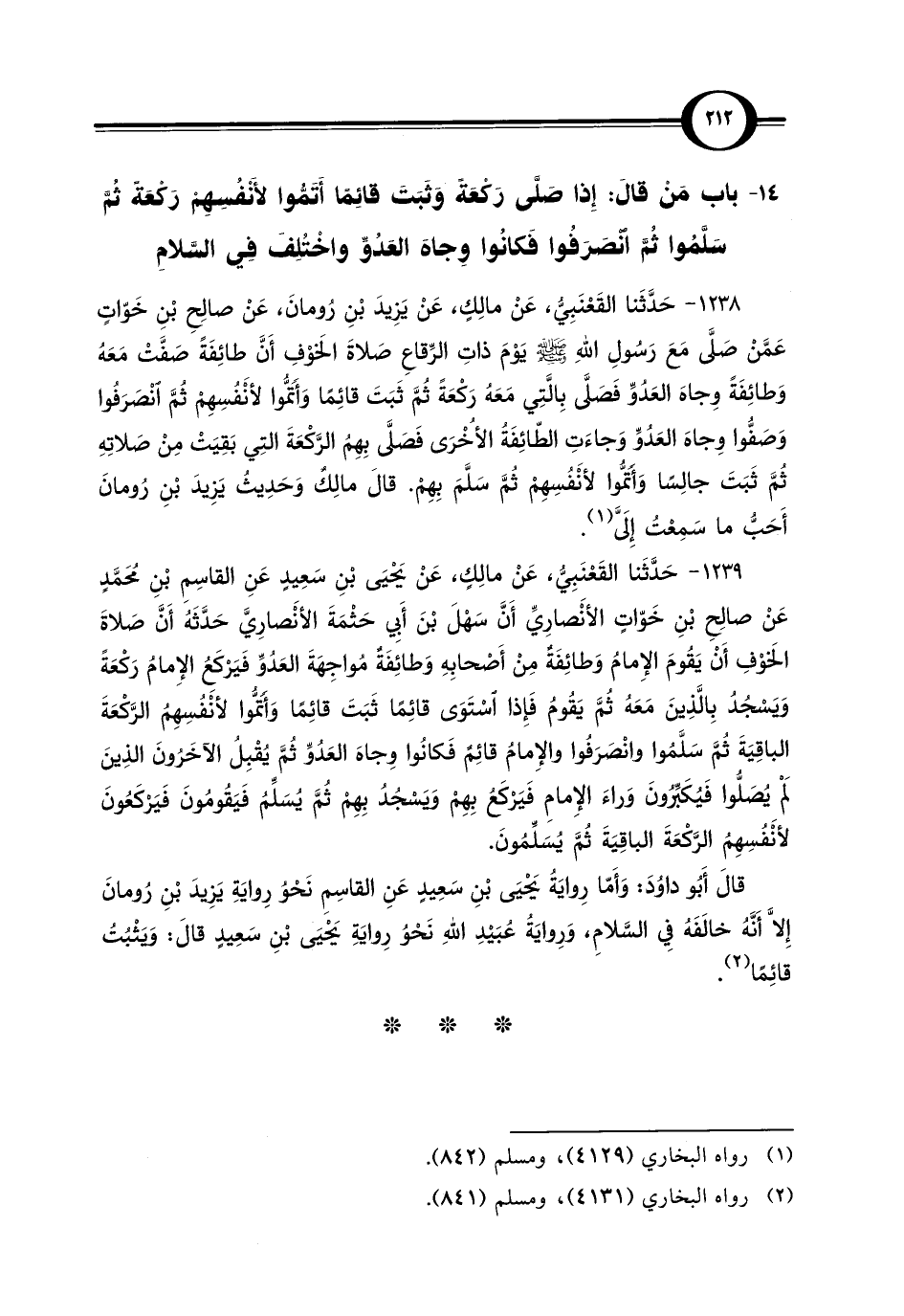 1238 - حَدَّثَنا القَعْنَبِيُّ، عَنْ مالِكٍ، عَنْ يَزِيدَ بْنِ رُومانَ، عَنْ صالِحِ بْنِ خَوَّاتٍ عَمَّنْ صَلَّى مَعَ رَسُولِ اللهِ - صلى الله عليه وسلم - يَوْمَ ذَاتِ الرِّقَاعِ صَلاةَ الخَوْفِ أَنَّ طَائِفَةً صَفَّتْ مَعَهُ وَطَائِفَةً وِجاهَ العَدُوِّ فَصَلَّى بِالَّتِي مَعَهُ رَكْعَةً ثُمَّ ثَبَتَ قَائِمًا وَأَتَمُّوا لأَنْفُسِهِمْ ثُمَّ انْصَرَفُوا وَصَفُّوا وِجاهَ العَدُوِّ وَجَاءَتِ الطَّائِفَةُ الأُخْرَى فَصَلَّى بِهِمُ الرَّكْعَةَ التِي بَقِيَتْ مِنْ صَلاتِهِ ثُمَّ ثَبَتَ جَالِسًا وَأَتَمُّوا لأَنْفُسِهِمْ ثُمَّ سَلَّمَ بِهِمْ. قَالَ مالِكٌ وَحَدِيثُ يَزِيدَ بْنِ رُومَانَ أَحَبُّ ما سَمِعْتُ إِلَيَّ (¬1).