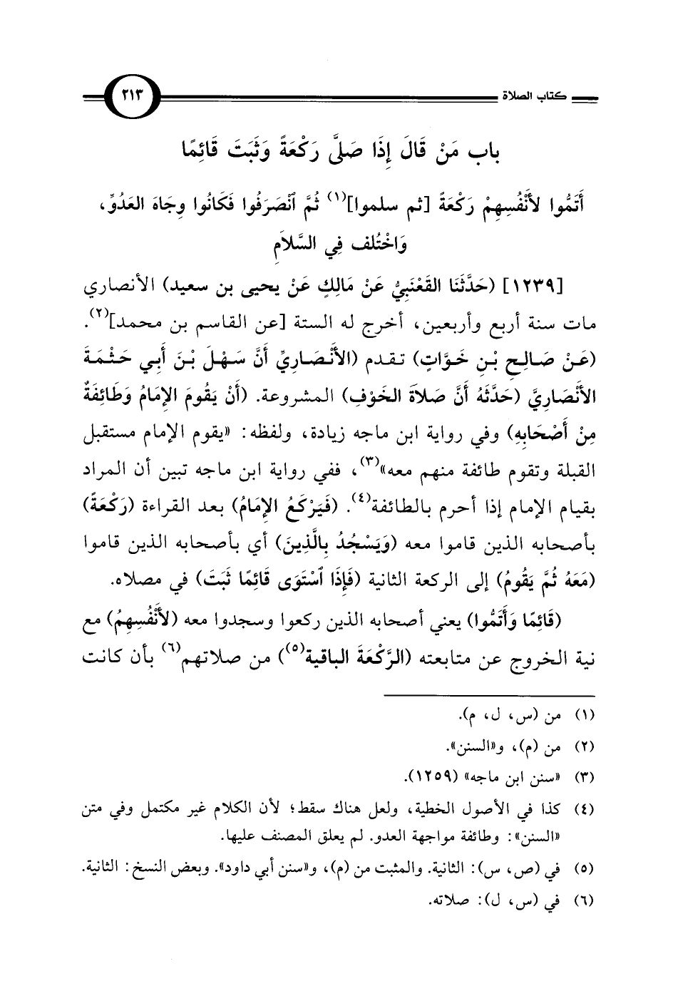 [1239] (حَدَّثَنَا القَعْنَبِيُّ عَنْ مَالِكٍ عَنْ يحيى بن سعيد) الأنصاري مات سنة أربع وأربعين، أخرج له الستة [عن القاسم بن محمد] (¬2). (عَنْ صَالِحِ بْنِ خَوَّاتٍ) تقدم (الأَنْصَارِيِّ أَنَّ سَهْلَ بْنَ أَبِي حَثْمَةَ الأَنْصَارِيَّ (حَدَّثَهُ أَنَّ صَلَاةَ الخَوْفِ) المشروعة. (أَنْ يَقُومَ الإِمَامُ وَطَائِفَةٌ مِنْ أَصْحَابِهِ) وفي رواية ابن ماجه زيادة، ولفظه: "يقوم الإمام مستقبل القبلة وتقوم طائفة منهم معه" (¬3)، ففي رواية ابن ماجه تبين أن المراد بقيام الإمام إذا أحرم بالطائفة (¬4). (فَيَرْكَعُ الإِمَامُ) بعد القراءة (رَكْعَةً) بأصحابه الذين قاموا معه (وَيَسْجُدُ بِالَّذِينَ) أي بأصحابه الذين قاموا (مَعَهُ ثُمَّ يَقُومُ) إلى الركعة الثانية (فَإِذَا اسْتَوَى قَائِمًا ثَبَتَ) في مصلاه.