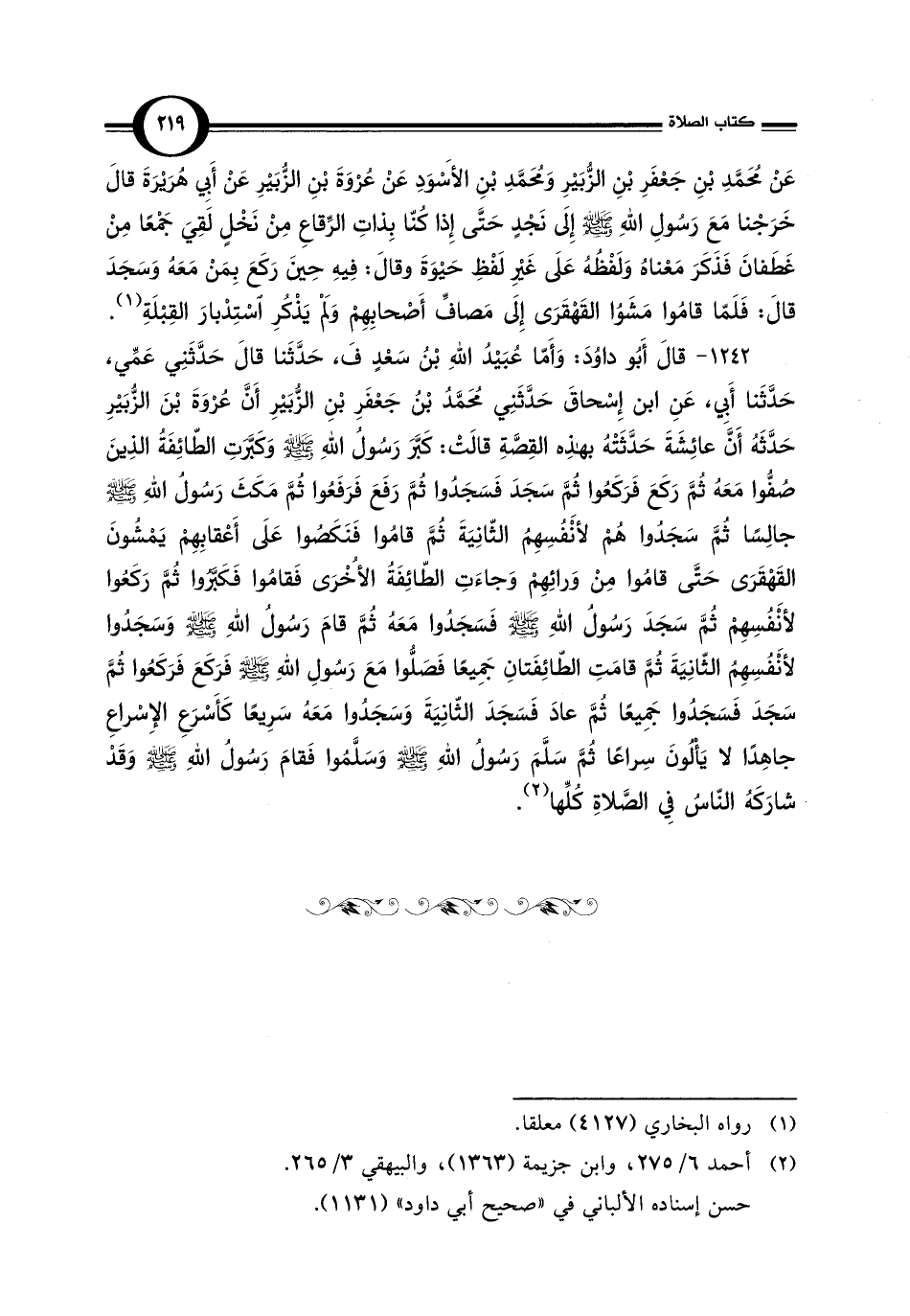 1242 - قَالَ أَبُو داوُدَ: وَأَمّا عُبَيْدُ اللهِ بْنُ سَعْدٍ فَ، حَدَّثَنا قَالَ حَدَّثَنِي عَمِّي، حَدَّثَنا أَبِي، عَنِ ابن إِسْحاقَ حَدَّثَنِي مُحَمَّدُ بْنُ جَعْفَرِ بْنِ الزُّبَيْرِ أَنَّ عُرْوَةَ بْنَ الزُّبَيْرِ حَدَّثَهُ أَنَّ عَائِشَةَ حَدَّثَتْهُ بهذِه القِصَّةِ قَالَتْ: كَبَّرَ رَسُولُ اللهِ - صلى الله عليه وسلم - وَكَبَّرَتِ الطَّائِفَةُ الذِينَ صُفُّوا مَعَهُ ثُمَّ رَكَعَ فَرَكَعُوا ثُمَّ سَجَدَ فَسَجَدُوا ثُمَّ رَفَعَ فَرَفَعُوا ثُمَّ مَكَثَ رَسُولُ اللهِ - صلى الله عليه وسلم - جالِسًا ثُمَّ سَجَدُوا هُمْ لأَنْفُسِهِمُ الثَّانِيَةَ ثُمَّ قامُوا فَنَكَصُوا عَلَى أَعْقابِهِمْ يَمْشُونَ القَهْقَرَى حَتَّى قامُوا مِنْ وَرائِهِمْ وَجَاءَتِ الطّائِفَةُ الأُخْرَى فَقامُوا فَكَبَّرُوا ثُمَّ رَكَعُوا لأَنْفُسِهِمْ ثُمَّ سَجَدَ رَسُولُ اللهِ - صلى الله عليه وسلم - فَسَجَدُوا مَعَهُ ثُمَّ قَامَ رَسُولُ اللهِ - صلى الله عليه وسلم - وَسَجَدُوا لأَنْفُسِهِمُ الثَّانِيَةَ ثُمَّ قامَتِ الطَّائِفَتانِ جَمِيعًا فَصَلُّوا مَعَ رَسُولِ اللهِ - صلى الله عليه وسلم - فَرَكَعَ فَرَكَعُوا ثُمَّ سَجَدَ فَسَجَدُوا جَمِيعًا ثُمَّ عَادَ فَسَجَدَ الثَّانِيَةَ وَسَجَدُوا مَعَهُ سَرِيعًا كَأَسْرَعِ الإِسْراعِ جاهِدًا لا يَأْلُونَ سِراعًا ثُمَّ سَلَّمَ رَسُولُ اللهِ - صلى الله عليه وسلم - وَسَلَّمُوا فَقَامَ رَسُولُ اللهِ - صلى الله عليه وسلم - وَقَدْ شَارَكَهُ النَّاسُ فِي الصَّلاةِ كُلِّها (¬2).