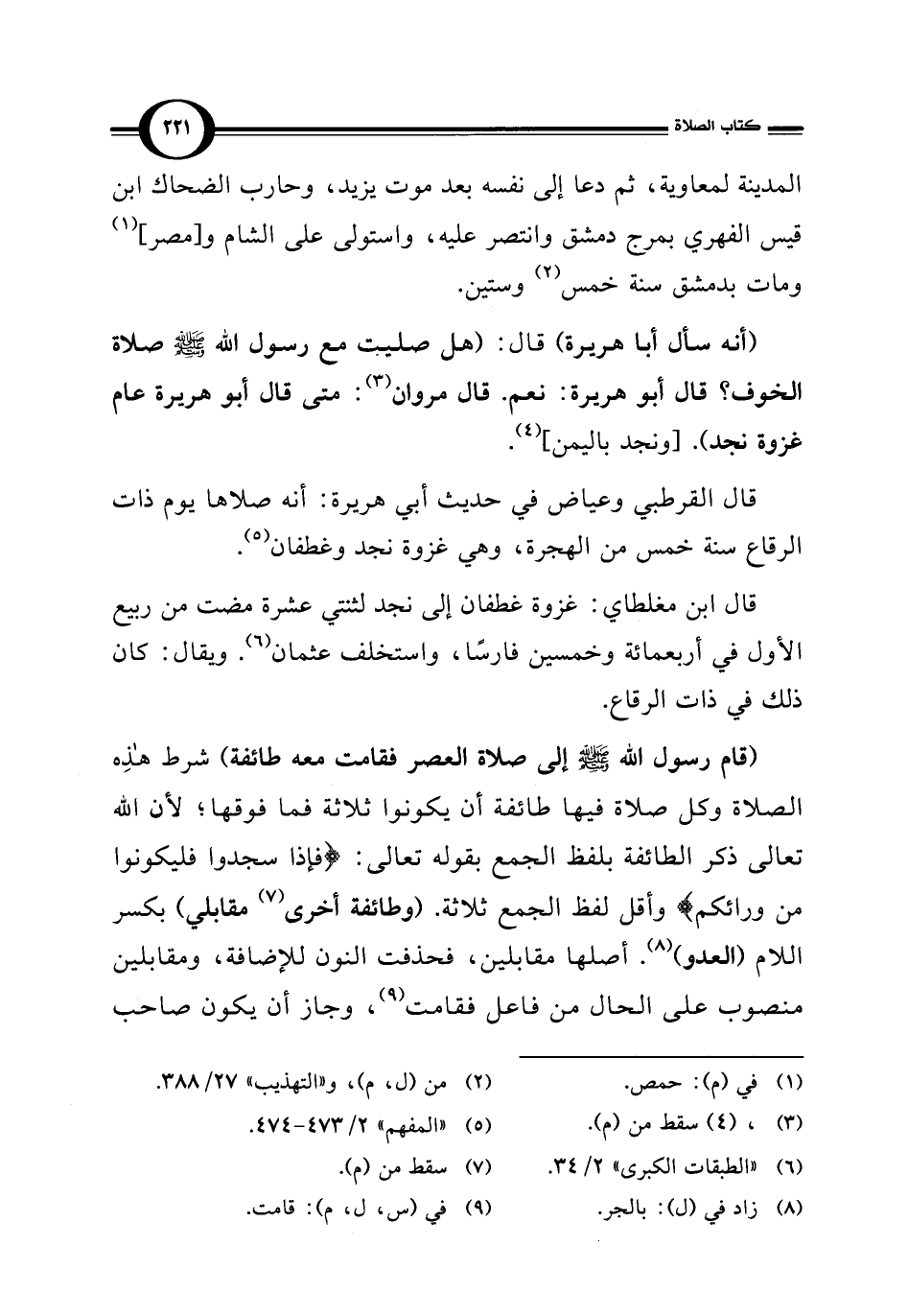(قام رسول الله - صلى الله عليه وسلم - إلى صلاة العصر فقامت معه طائفة) شرط هذِه الصلاة وكل صلاة فيها طائفة أن يكونوا ثلاثة فما فوقها؛ لأن الله تعالى ذكر الطائفة بلفظ الجمع بقوله تعالى: {فَإِذَا سَجَدُوا فَلْيَكُونُوا مِنْ وَرَائِكُمْ} وأقل لفظ الجمع ثلاثة. (وطائفة أخرى (¬7) مقابلي) بكسر اللام (العدو) (¬8). أصلها مقابلين، فحذفت النون للإضافة، ومقابلين منصوب على الحال من فاعل فقامت (¬9)، وجاز أن يكون صاحب