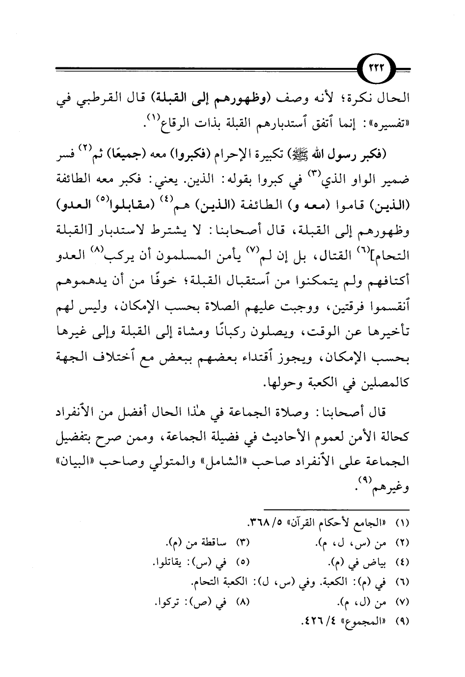 (فكبر رسول الله - صلى الله عليه وسلم -) تكبيرة الإحرام (فكبروا) معه (جميعًا) ثم (¬2) فسر ضمير الواو الذي (¬3) في كبروا بقوله: الذين. يعني: فكبر معه الطائفة (الذين) قاموا (معه و) الطائفة (الذين) هم (¬4) (مقابلوا (¬5) العدو) وظهورهم إلى القبلة، قال أصحابنا: لا يشترط لاستدبار [القبلة التحام] (¬6) القتال، بل إن لم (¬7) يأمن المسلمون أن يركب (¬8) العدو أكتافهم ولم يتمكنوا من استقبال القبلة؛ خوفًا من أن يدهموهم انقسموا فرقتين، ووجبت عليهم الصلاة بحسب الإمكان، وليس لهم تأخيرها عن الوقت، ويصلون ركبانًا ومشاة إلى القبلة وإلى غيرها بحسب الإمكان، ويجوز اقتداء بعضهم ببعض مع اختلاف الجهة كالمصلين في الكعبة وحولها.