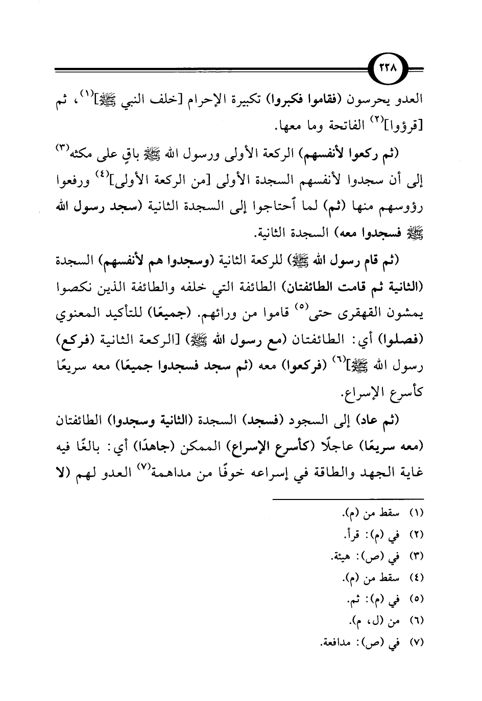 (ثم قام رسول الله - صلى الله عليه وسلم -) للركعة الثانية (وسجدوا هم لأنفسهم) السجدة (الثانية ثم قامت الطائفتان) الطائفة التي خلفه والطائفة الذين نكصوا يمشون القهقرى حتى (¬5) قاموا من ورائهم. (جميعًا) للتأكيد المعنوي (فصلوا) أي: الطائفتان (مع رسول الله - صلى الله عليه وسلم -) [الركعة الثانية (فركع) رسول الله - صلى الله عليه وسلم -] (¬6) (فركعوا) معه (ثم سجد فسجدوا جميعًا) معه سريعًا كأسرع الإسراع.