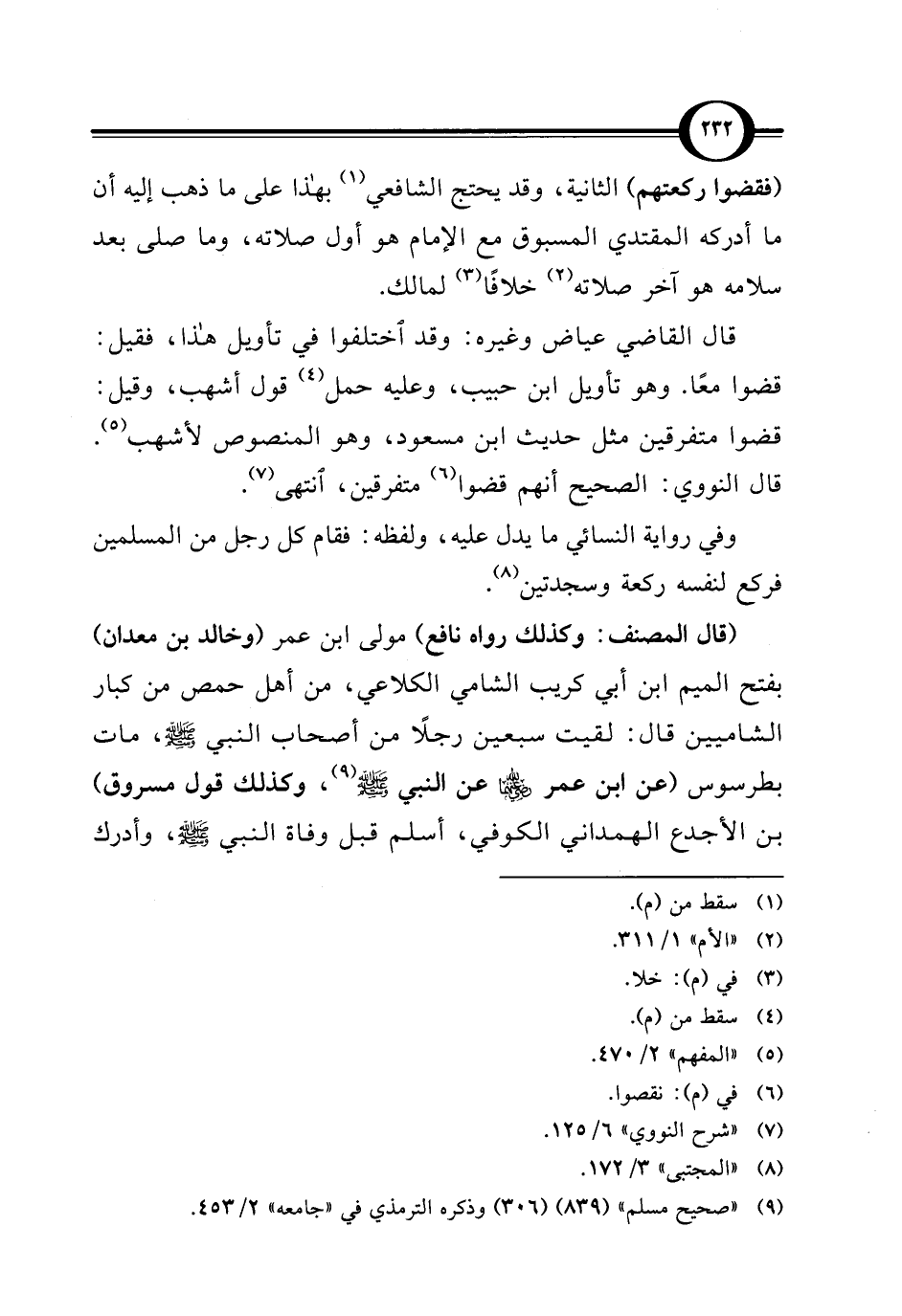 (فقضوا ركعتهم) الثانية، وقد يحتج الشافعي (¬1) بهذا على ما ذهب إليه أن ما أدركه المقتدي المسبوق مع الإمام هو أول صلاته، وما صلى بعد سلامه هو آخر صلاته (¬2) خلافًا (¬3) لمالك.