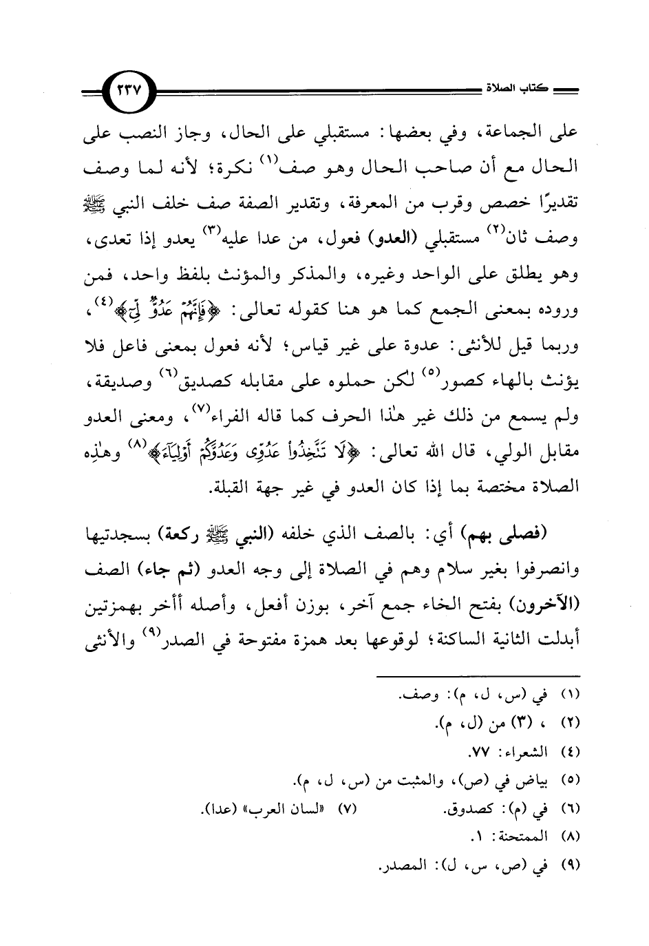 على الجماعة، وفي بعضها: مستقبلي على الحال، وجاز النصب على الحال مع أن صاحب الحال وهو صف (¬1) نكرة؛ لأنه لما وصف تقديرًا خصص وقرب من المعرفة، وتقدير الصفة صف خلف النبي - صلى الله عليه وسلم - وصف ثان (¬2) مستقبلي (العدو) فعول، من عدا عليه (¬3) يعدو إذا تعدى، وهو يطلق على الواحد وغيره، والمذكر والمؤنث بلفظ واحد، فمن وروده بمعنى الجمع كما هو هنا كقوله تعالى: {فَإِنَّهُمْ عَدُوٌّ لِي} (¬4)، وربما قيل للأنثى: عدوة على غير قياس؛ لأنه فعول بمعنى فاعل فلا يؤنث بالهاء كصور (¬5) لكن حملوه على مقابله كصديق (¬6) وصديقة، ولم يسمع من ذلك غير هذا الحرف كما قاله الفراء (¬7)، ومعنى العدو مقابل الولي، قال الله تعالى: {لَا تَتَّخِذُوا عَدُوِّي وَعَدُوَّكُمْ أَوْلِيَاءَ} (¬8) وهذِه الصلاة مختصة بما إذا كان العدو في غير جهة القبلة.