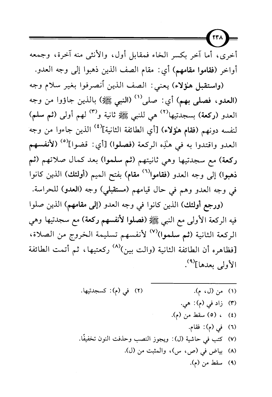 (ورجع أولئك) الذين كانوا في وجه العدو (إلى مقامهم) الذين صلوا فيه الركعة الأولى مع النبي - صلى الله عليه وسلم - (فصلوا لأنفسهم ركعة) مع سجدتيها وهي الركعة الثانية (ثم سلموا) (¬7) لأنفسهم تسليمة الخروج من الصلاة، [فظاهره أن الطائفة الثانية (والت بين) (¬8) ركعتيها، ثم أتمت الطائفة الأولى بعدها] (¬9).