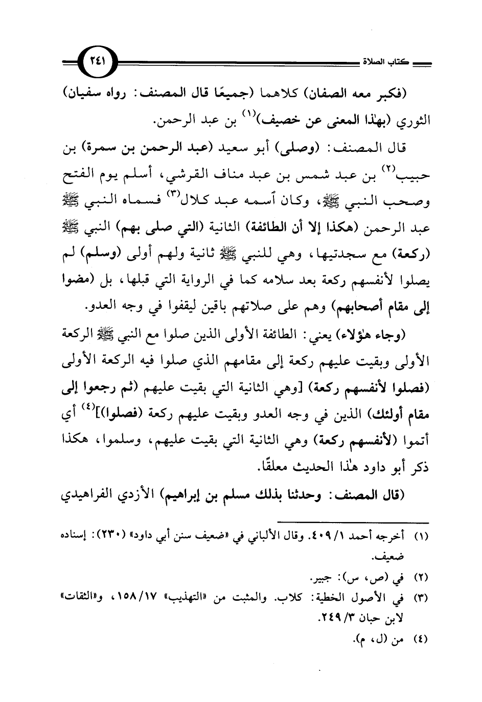 (وجاء هؤلاء) يعني: الطائفة الأولى الذين صلوا مع النبي - صلى الله عليه وسلم - الركعة الأولى وبقيت عليهم ركعة إلى مقامهم الذي صلوا فيه الركعة الأولى (فصلوا لأنفسهم ركعة) [وهي الثانية التي بقيت عليهم (ثم رجعوا إلى مقام أولئك) الذين في وجه العدو وبقيت عليهم ركعة (فصلوا)] (¬4) أي أتموا (لأنفسهم ركعة) وهي الثانية التي بقيت عليهم، وسلموا، هكذا ذكر أبو داود هذا الحديث معلقًا.
