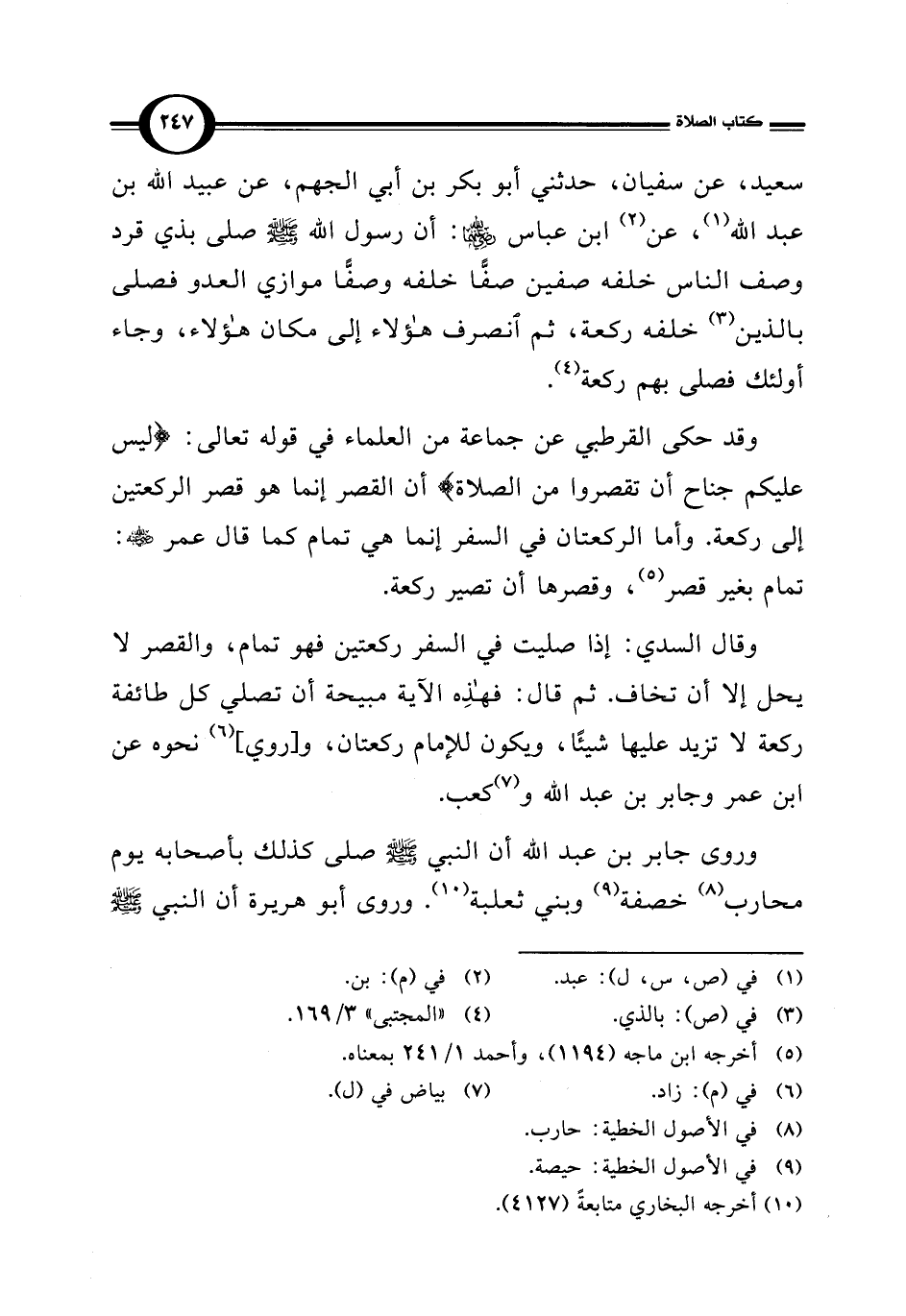 سعيد، عن سفيان، حدثني أبو بكر بن أبي الجهم، عن عبيد الله بن عبد الله (¬1)، عن (¬2) ابن عباس - رضي الله عنهما -: أن رسول الله - صلى الله عليه وسلم - صلى بذي قرد وصف الناس خلفه صفين صفًّا خلفه وصفًّا موازي العدو فصلى بالذين (¬3) خلفه ركعة، ثم انصرف هؤلاء إلى مكان هؤلاء، وجاء أولئك فصلى بهم ركعة (¬4).