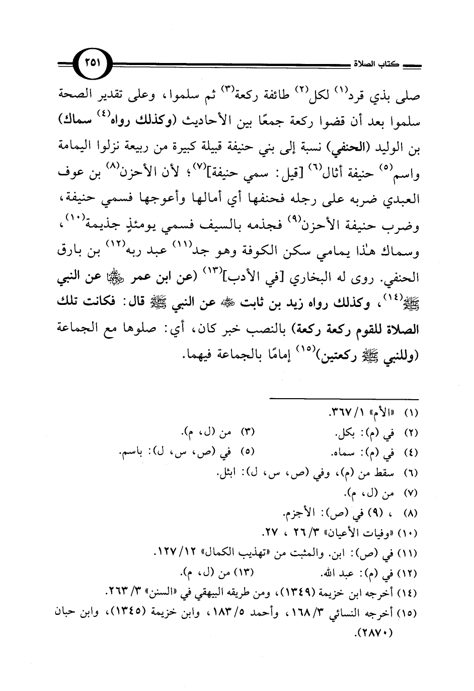 صلى بذي قرد (¬1) لكل (¬2) طائفة ركعة (¬3) ثم سلموا، وعلى تقدير الصحة سلموا بعد أن قضوا ركعة جمعًا بين الأحاديث (وكذلك رواه (¬4) سماك) بن الوليد (الحنفي) نسبة إلى بني حنيفة قبيلة كبيرة من ربيعة نزلوا اليمامة واسم (¬5) حنيفة أثال (¬6) [قيل: سمي حنيفة] (¬7)؛ لأن الأحزن (¬8) بن عوف العبدي ضربه على رجله فحنفها أي أمالها وأعوجها فسمي حنيفة، وضرب حنيفة الأحزن (¬9) فجذمه بالسيف فسمي يومئذٍ جذيمة (¬10)، وسماك هذا يمامي سكن الكوفة وهو جد (¬11) عبد ربه (¬12) بن بارق الحنفي. روى له البخاري [في الأدب] (¬13) (عن ابن عمر - رضي الله عنهما - عن النبي - صلى الله عليه وسلم - (¬14)، وكذلك رواه زيد بن ثابت - رضي الله عنه - عن النبي - صلى الله عليه وسلم - قال: فكانت تلك الصلاة للقوم ركعة ركعة) بالنصب خبر كان، أي: صلوها مع الجماعة (وللنبي - صلى الله عليه وسلم - ركعتين) (¬15) إمامًا بالجماعة فيهما.