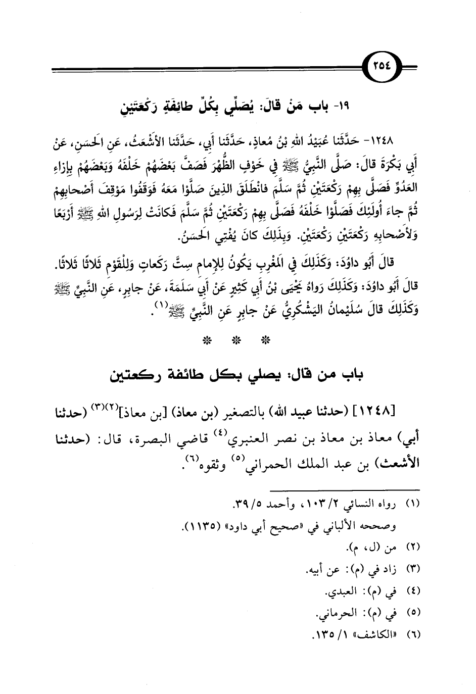 1248 - حَدَّثَنا عُبَيْدُ اللهِ بْنُ مُعاذٍ، حَدَّثَنا أَبِي، حَدَّثَنا الأَشْعَثُ، عَنِ الحَسَنِ، عَنْ أَبِي بَكْرَةَ قَالَ: صَلَّى النَّبِيُّ - صلى الله عليه وسلم - فِي خَوْفٍ الظُّهْرَ فَصَفَّ بَعْضَهُمْ خَلْفَهُ وَبَعْضَهُمْ بِإِزاءِ العَدُوِّ فَصَلَّى بِهِمْ رَكْعَتَيْنِ ثُمَّ سَلَّمَ فانْطَلَقَ الذِينَ صَلَّوْا مَعَهُ فَوَقَفُوا مَوْقِفَ أَصْحابِهِمْ ثُمَّ جَاءَ أُوْلَئِكَ فَصَلَّوْا خَلْفَهُ فَصَلَّى بِهِمْ رَكْعَتَيْنِ ثُمَّ سَلَّمَ فَكَانَتْ لِرَسُولِ اللهِ - صلى الله عليه وسلم - أَرْبَعًا وَلأَصْحَابِهِ رَكْعَتَيْنِ رَكْعَتَيْنِ. وَبِذَلِكَ كَانَ يُفْتِي الحَسَنُ.