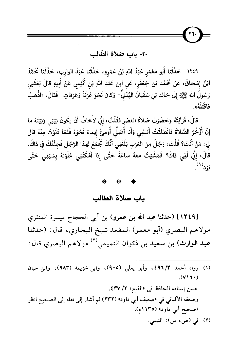 [1249] (حدثنا عبد الله بن عمرو) بن أبي الحجاج ميسرة المنقري مولاهم البصري (أبو معمر) المقعد شيخ البخاري، قال: (حدثنا عبد الوارث) بن سعيد بن ذكوان التميمي (¬2) مولاهم البصري قال: