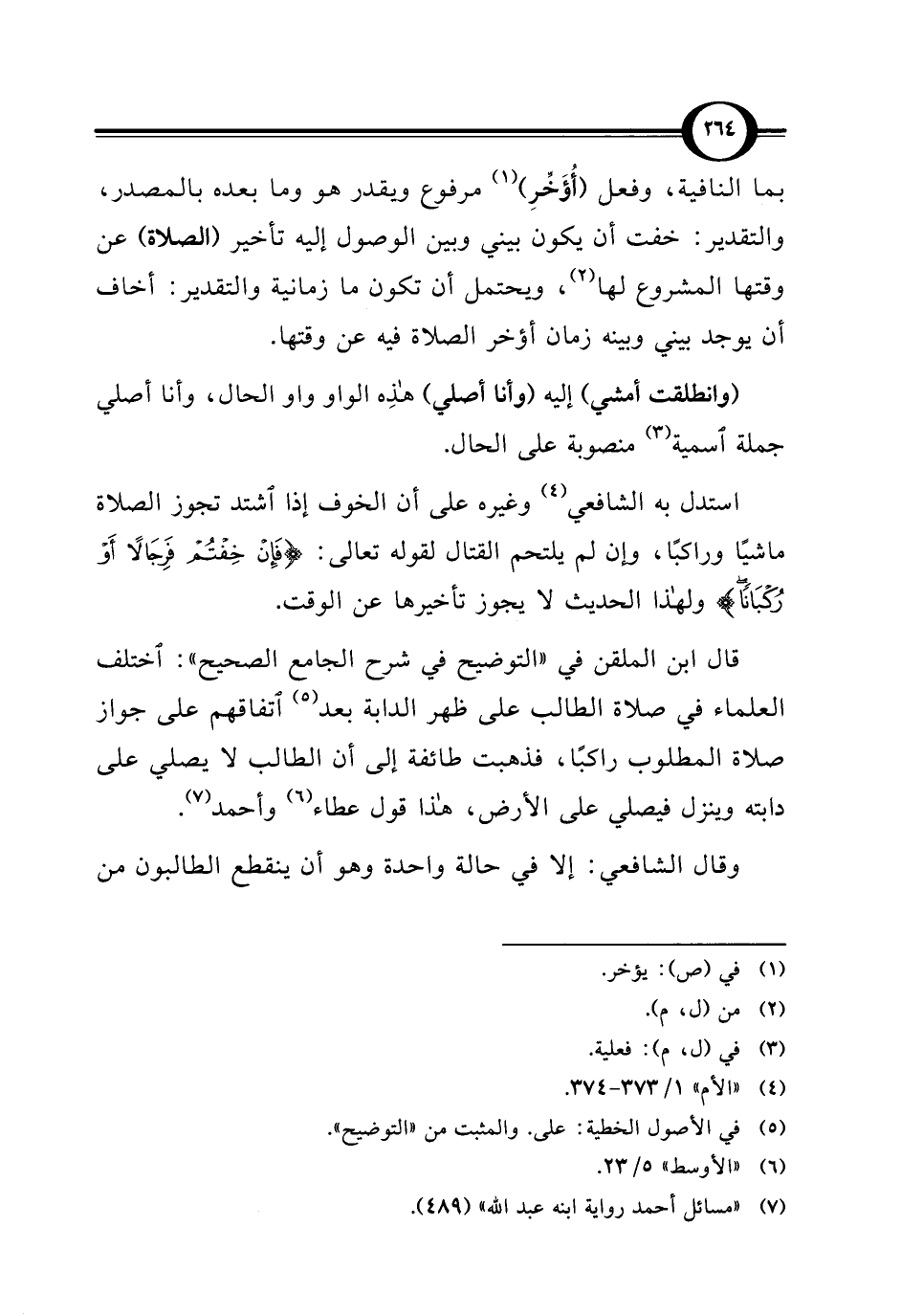 بما النافية، وفعل (أُؤَخِّرِ) (¬1) مرفوع ويقدر هو وما بعده بالمصدر، والتقدير: خفت أن يكون بيني وبين الوصول إليه تأخير (الصلاة) عن وقتها المشروع لها (¬2)، ويحتمل أن تكون ما زمانية والتقدير: أخاف أن يوجد بيني وبينه زمان أؤخر الصلاة فيه عن وقتها.