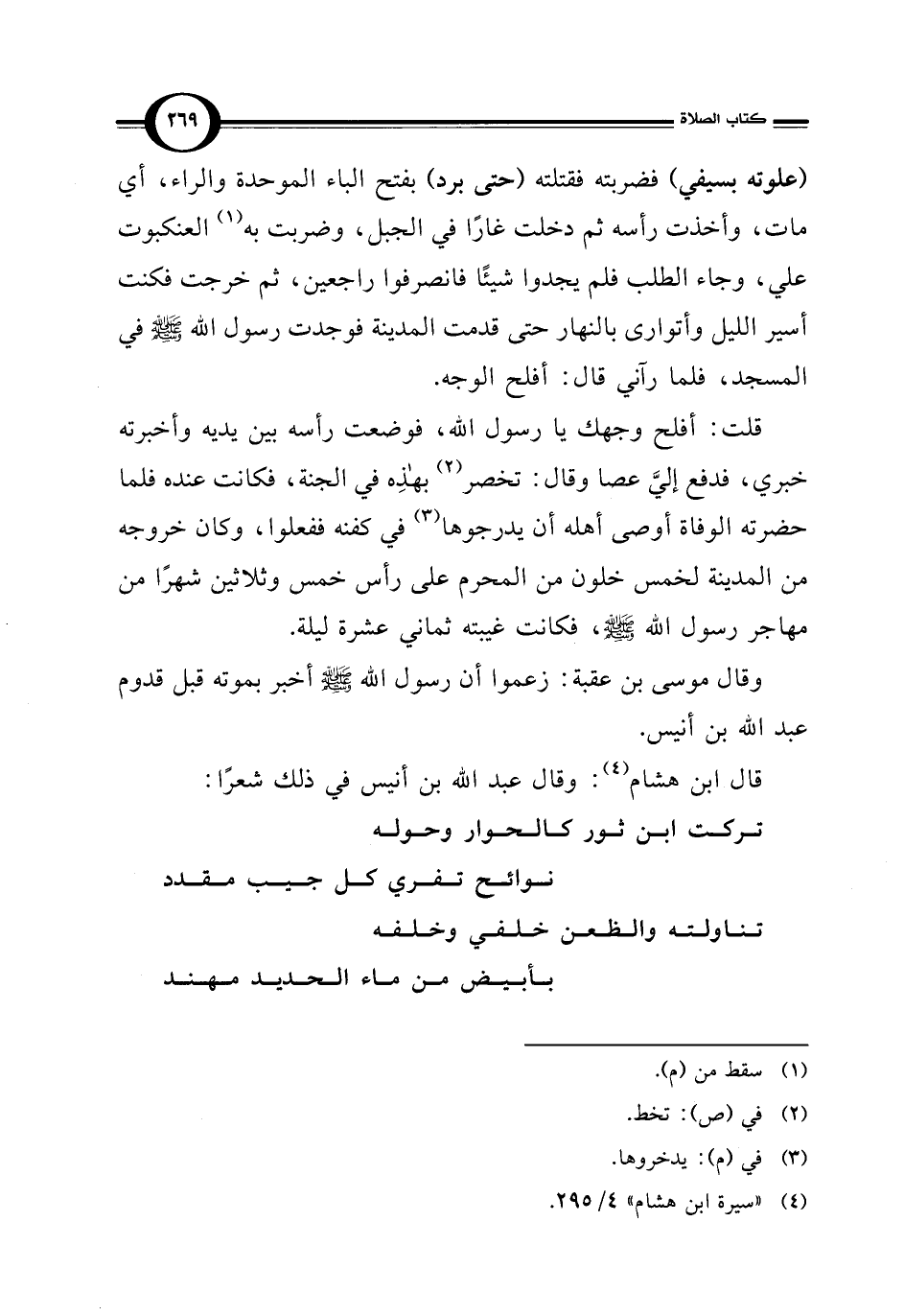 (علوته بسيفي) فضربته فقتلته (حتى برد) بفتح الباء الموحدة والراء، أي مات، وأخذت رأسه ثم دخلت غارًا في الجبل، وضربت به (¬1) العنكبوت علي، وجاء الطلب فلم يجدوا شيئًا فانصرفوا راجعين، ثم خرجت فكنت أسير الليل وأتوارى بالنهار حتى قدمت المدينة فوجدت رسول الله - صلى الله عليه وسلم - في المسجد، فلما رآني قال: أفلح الوجه.