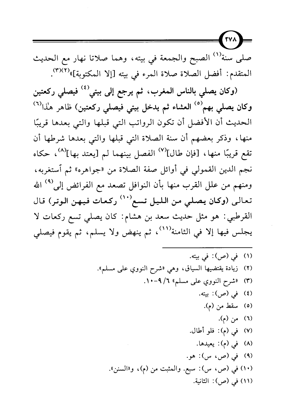 صلى سنة (¬1) الصبح والجمعة في بيته، وهما صلاتا نهار مع الحديث المتقدم: أفضل الصلاة صلاة المرء في بيته [إلا المكتوبة] " (¬2) (¬3).