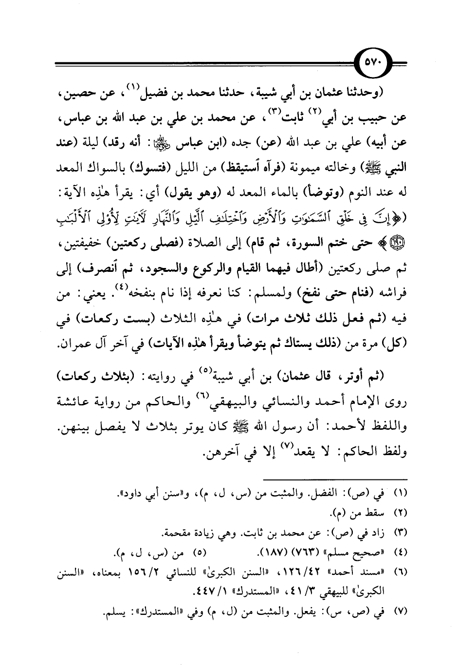 (وحدثنا عثمان بن أبي شيبة، حدثنا محمد بن فضيل (¬1)، عن حصين، عن حبيب بن أبي (¬2) ثابت (¬3)، عن محمد بن علي بن عبد الله بن عباس، عن أبيه) علي بن عبد الله (عن) جده (ابن عباس - رضي الله عنهما -: أنه رقد) ليلة (عند النبي - صلى الله عليه وسلم -) وخالته ميمونة (فرآه استيقظ) من الليل (فتسوك) بالسواك المعد له عند النوم (وتوضأ) بالماء المعد له (وهو يقول) أي: يقرأ هذِه الآية: ({إِنَّ فِي خَلْقِ السَّمَاوَاتِ وَالْأَرْضِ وَاخْتِلَافِ اللَّيْلِ وَالنَّهَارِ لَآيَاتٍ لِأُولِي الْأَلْبَابِ (190)} حتى ختم السورة، ثم قام) إلى الصلاة (فصلى ركعتين) خفيفتين، ثم صلى ركعتين (أطال فيهما القيام والركوع والسجود، ثم انصرف) إلى فراشه (فنام حتى نفخ) ولمسلم: كنا نعرفه إذا نام بنفخه (¬4). يعني: من فيه (ثم فعل ذلك ثلاث مرات) في هذِه الثلاث (بست ركعات) في (كل) مرة من (ذلك يستاك ثم يتوضأ ويقرأ هذِه الآيات) في آخر آل عمران.