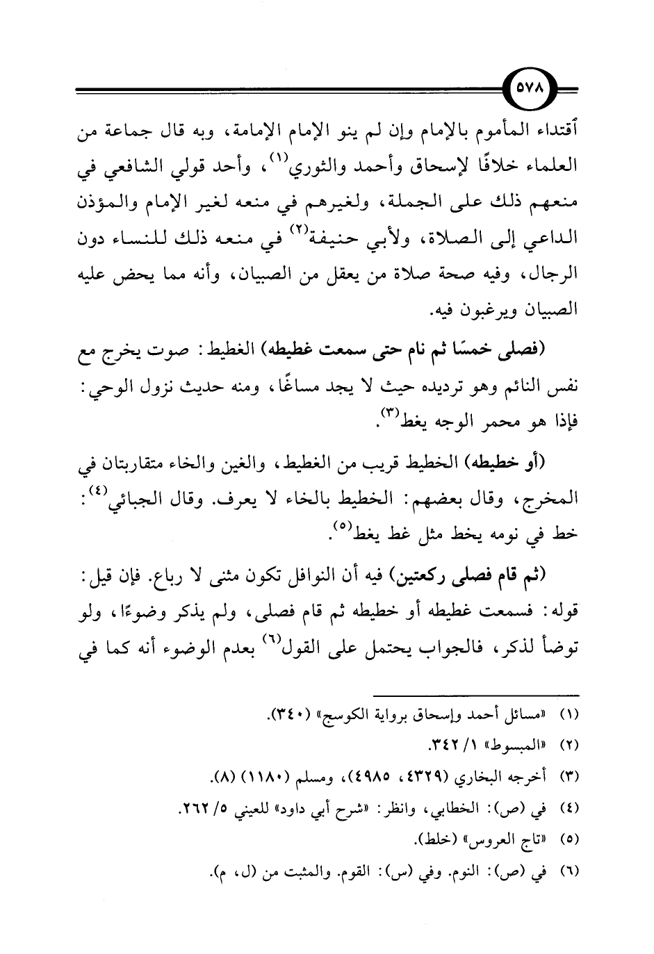 (فصلى خمسًا ثم نام حتى سمعت غطيطه) الغطيط: صوت يخرج مع نفس النائم وهو ترديده حيث لا يجد مساغًا، ومنه حديث نزول الوحي: فإذا هو محمر الوجه يغط (¬3).