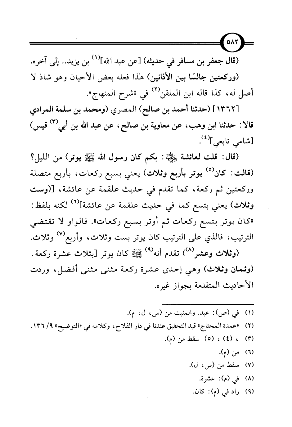 (قال: قلت لعائشة - رضي الله عنها -: بكم كان رسول الله - صلى الله عليه وسلم - يوتر) من الليل؟ (قالت: كان (¬5) يوتر بأربع وثلاث) يعني بسبع ركعات، بأربع متصلة وركعتين ثم ركعة، كما تقدم في حديث علقمة عن عائشة، [(وست وثلاث) يعني بتسع كما في حديث علقمة عن عائشة] (¬6) لكنه بلفظ: "كان يوتر بتسع ركعات ثم أوتر بسبع ركعات". فالواو لا تقتضي الترتيب، فالذي على الترتيب كان يوتر بست وثلاث، وأربع (¬7) وثلاث.