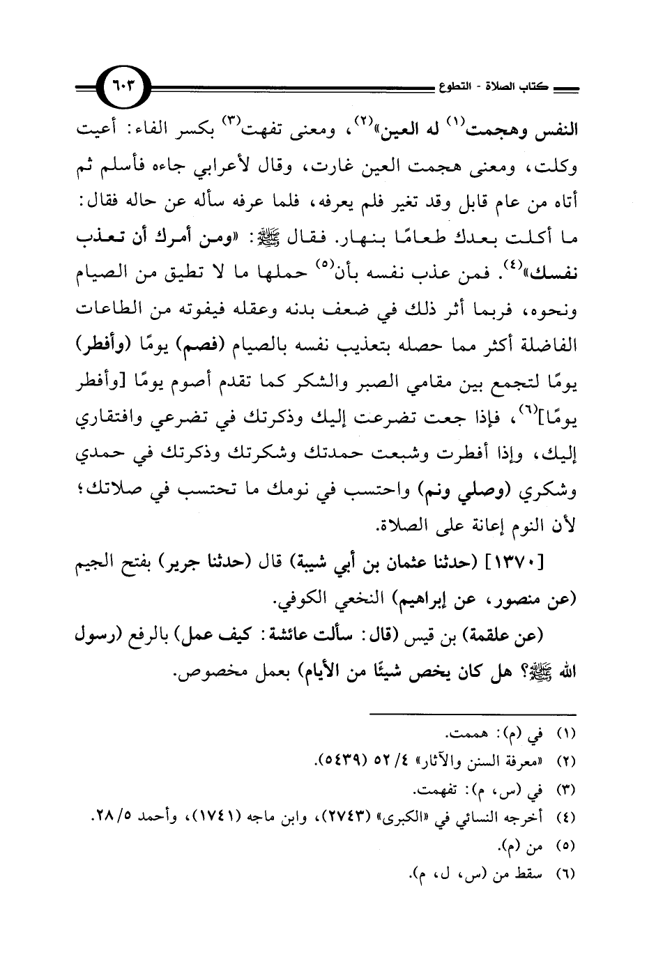 النفس وهجمت (¬1) له العين" (¬2)، ومعنى تفهت (¬3) بكسر الفاء: أعيت وكلت، ومعنى هجمت العين غارت، وقال لأعرابي جاءه فأسلم ثم أتاه من عام قابل وقد تغير فلم يعرفه، فلما عرفه سأله عن حاله فقال: ما أكلت بعدك طعامًا بنهار. فقال - صلى الله عليه وسلم -: "ومن أمرك أن تعذب نفسك" (¬4). فمن عذب نفسه بأن (¬5) حملها ما لا تطيق من الصيام ونحوه، فربما أثر ذلك في ضعف بدنه وعقله فيفوته من الطاعات الفاضلة أكثر مما حصله بتعذيب نفسه بالصيام (فصم) يومًا (وأفطر) يومًا لتجمع بين مقامي الصبر والشكر كما تقدم أصوم يومًا [وأفطر يومًا] (¬6)، فإذا جعت تضرعت إليك وذكرتك في تضرعي وافتقاري إليك، وإذا أفطرت وشبعت حمدتك وشكرتك وذكرتك في حمدي وشكري (وصلي ونم) واحتسب في نومك ما تحتسب في صلاتك؛ لأن النوم إعانة على الصلاة.