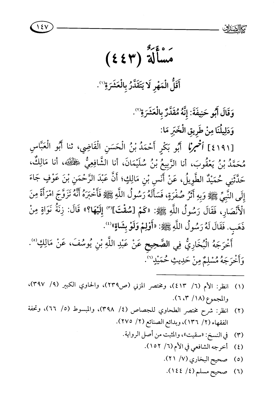 [4191] أخبرنا أَبُو بَكْرٍ أَحْمَدُ بْنُ الْحَسَنِ الْقَاضِي، ثنا أَبُو الْعَبَّاسِ مُحَمَّدُ بْنُ يَعْقُوبَ، أنا الرَّبِيعُ بْنُ سُلَيْمَانَ، أنا الشَّافِعِيُّ - رحمه الله -، أنا مَالِكٌ، حَدَّثَنِي حُمَيْدٌ الطَّوِيلُ، عَنْ أَنَسِ بْنِ مَالِكٍ؛ أَنَّ عَبْدَ الرَّحْمَنِ بْنَ عَوْفٍ جَاءَ إِلَى النَّبِيِّ - صلى الله عليه وسلم - وَبِهِ أَثَرُ صُفْرَةٍ، فَسَأَلَهُ رَسُولُ اللَّهِ - صلى الله عليه وسلم - فَأَخْبَرَهُ أَنَّهُ تَزَوَّجَ امْرَأَةً مِنَ الْأَنْصَارِ، فَقَالَ رَسُولُ اللَّهِ - صلى الله عليه وسلم -: "كَمْ [سُقْتَ] (¬3) إِلَيْهَا؟ " قَالَ: زِنَةُ نَوَاةٍ مِنْ ذَهَبٍ. فَقَالَ لَهُ رَسُولُ اللَّهِ - صلى الله عليه وسلم -: "أَوْلِمْ وَلَوْ بِشَاةٍ" (¬4).