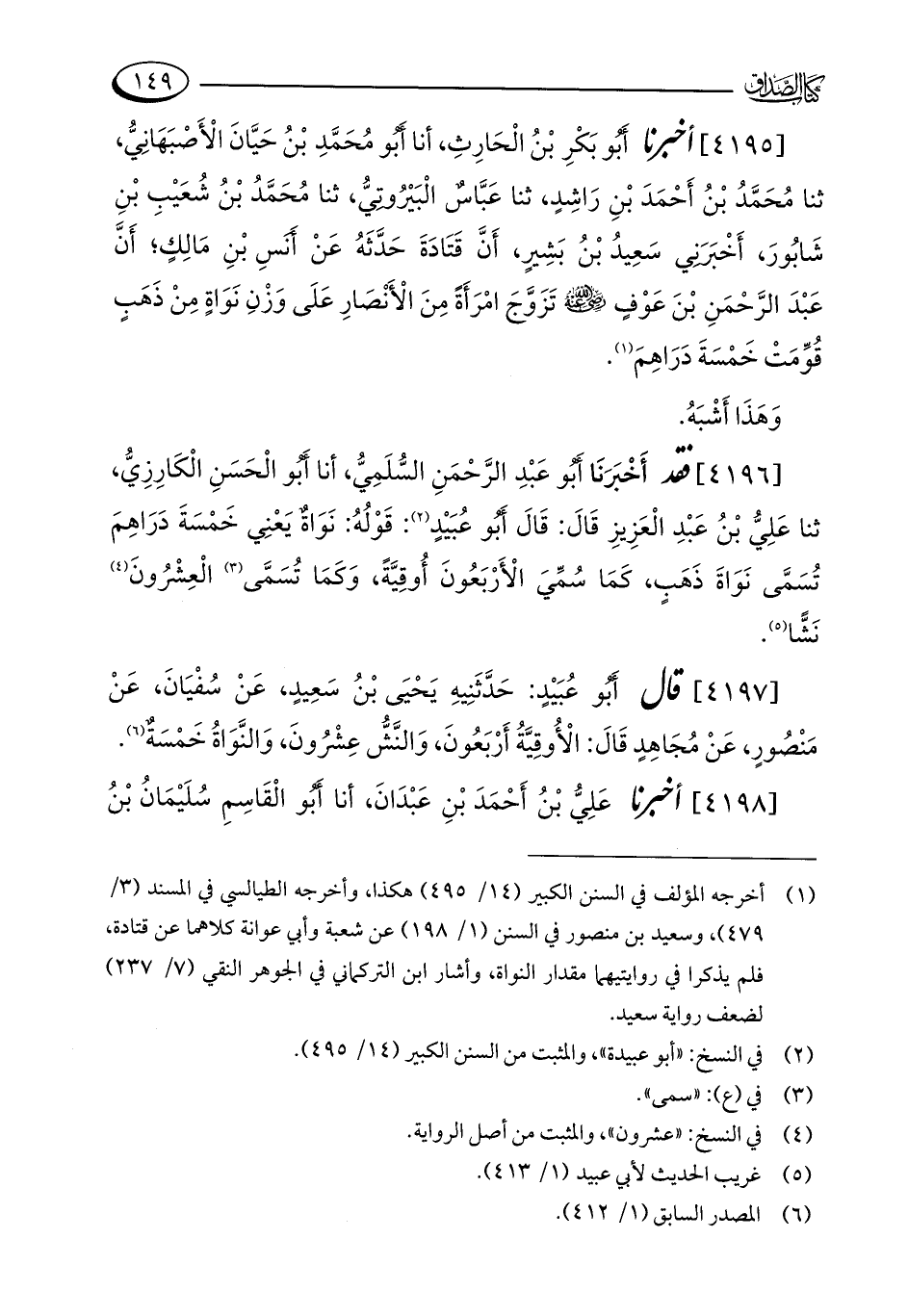 [4196] فقد أَخْبَرَنَا أَبُو عَبْدِ الرَّحْمَنِ السُّلَمِيُّ، أنا أَبُو الْحَسَنِ الْكَارِزِيُّ، ثنا عَلِيُّ بْنُ عَبْدِ الْعَزِيزِ قَالَ: قَالَ أَبُو عُبَيْدٍ (¬2): قَوْلُهُ: نَوَاةٌ يَعْنِي خَمْسَةَ دَرَاهِمَ تُسَمَّى نَوَاةَ ذَهَبٍ، كَمَا سُمِّيَ الْأَرْبَعُونَ أُوقِيَّةً، وَكَمَا تُسَمَّى (¬3) الْعِشْرُونَ (¬4) نَشًّا (¬5).