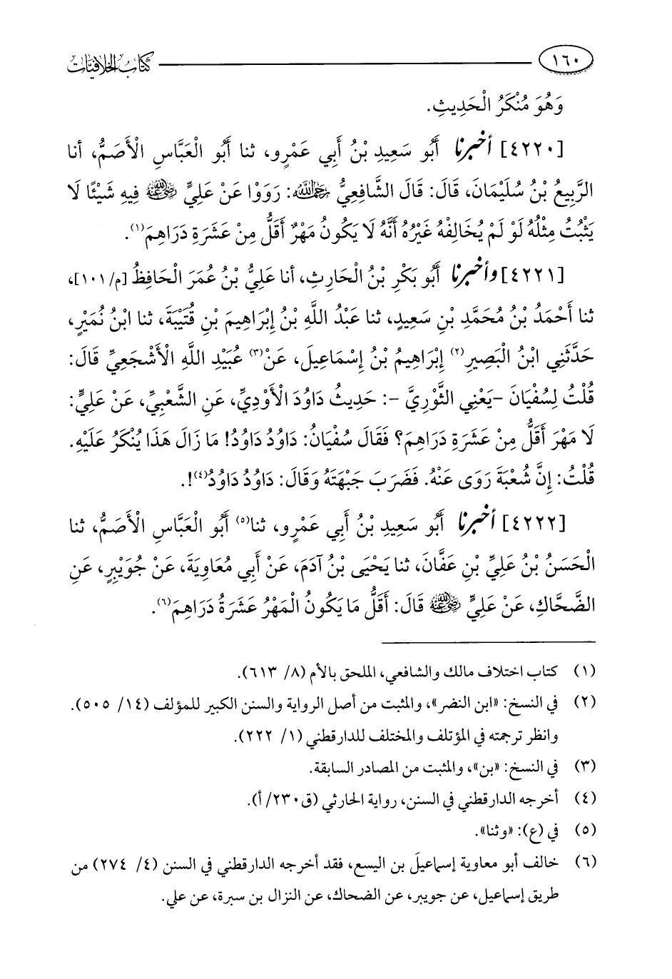 [4221] وأخبرنا أَبُو بَكْرِ بْنُ الْحَارِثِ، أنا عَلِيُّ بْنُ عُمَرَ الْحَافِظُ، ثنا أَحْمَدُ بْنُ مُحَمَّدِ بْنِ سَعِيدٍ، ثنا عَبْدُ اللَّهِ بْنُ إِبْرَاهِيمَ بْنِ قُتَيْبَةَ، ثنا ابْنُ نُمَيْرٍ، حَدَّثَنِي ابْنُ الْبَصِيرِ (¬2) إِبْرَاهِيمُ بْنُ إِسْمَاعِيلَ، عَنْ (¬3) عُبَيْدِ اللَّهِ الْأَشْجَعِيِّ قَالَ: قُلْتُ لِسُفْيَانَ - يَعْنِي الثَّوْرِيَّ -: حَدِيثُ دَاوُدَ الْأَوْدِيِّ، عَنِ الشَّعْبِيِّ، عَنْ عَلِيٍّ: لَا مَهْرَ أَقَلُّ مِنْ عَشَرَةِ دَرَاهِمَ؟ فَقَالَ سُفْيَانُ: دَاوُدُ دَاوُدُ! مَا زَالَ هَذَا يُنْكَرُ عَلَيْهِ. قُلْتُ: إِنَّ شُعْبَةَ رَوَى عَنْهُ. فَضَرَبَ جَبْهَتَهُ وَقَالَ: دَاوُدُ دَاوُدُ (¬4)! .