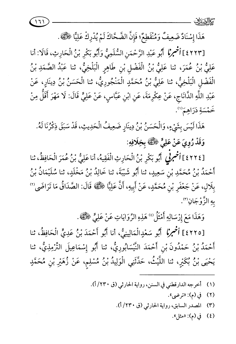 [4224] أخبرني أَبُو بَكْرِ بْنُ الْحَارِثِ الْفَقِيهُ، أنا عَلِيُّ بْنُ عُمَرَ الْحَافِظُ، ثنا أَحْمَدُ بْنُ مُحَمَّدِ بْنِ سَعِيدٍ، ثنا أَبُو شَيْبَةَ، ثنا خَالِدُ بْنُ مَخْلَدٍ، ثنا سُلَيْمَانُ بْنُ بِلَالٍ، عَنْ جَعْفَرِ بْنِ مُحَمَّدٍ، عَنْ أَبِيهِ، أَنَّ عَلِيًّا - رضي الله عنه - قَالَ: الصَّدَاقُ مَا تَرَاضَى (¬2) بِهِ الزَّوْجَانِ (¬3).